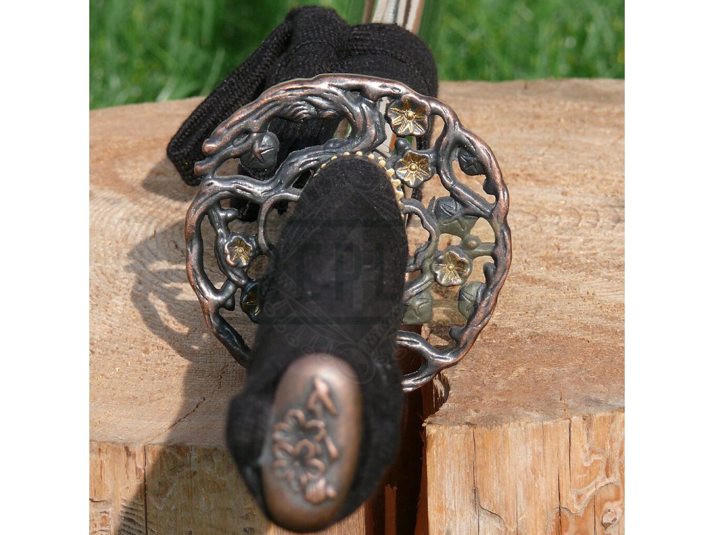 Předlohu této neobyčejně krásné tsuby zhotovil jistě velký mistr pravděpodobně v 18. století. Jelikož se pod své dílo nepodepsali, na rozdíl od kovářů čepelí nejsou bohužel tvůrci tsub známí jménem. Tsuba a ostatní ozdoby jsou důmyslně zdobeny zlatými třešňovými květy sakury, jedním z nejdůležitějších symbolů japonské kultury. Představují čistou krásu, odchod a pomíjivost.