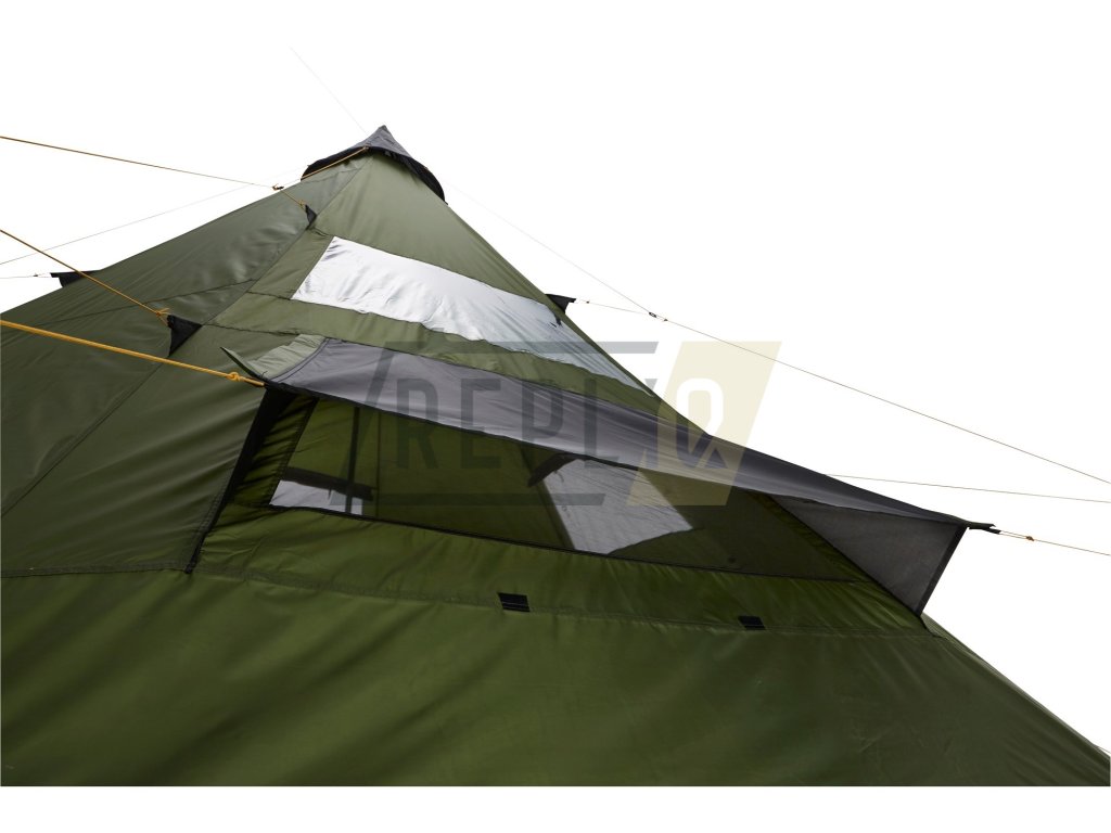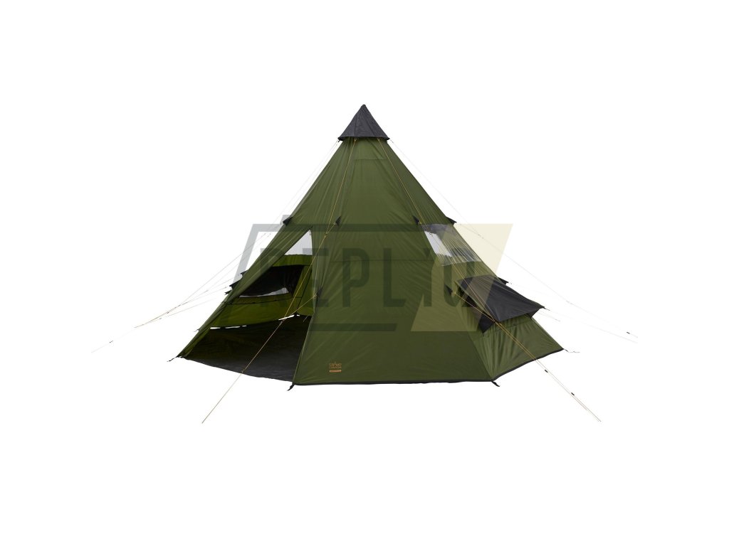 Velké týpí z polyesterové stanovky s atypickou centrální ocelovou tyčí, lehké, snadno transportovatelné, jednoduchá stavba.