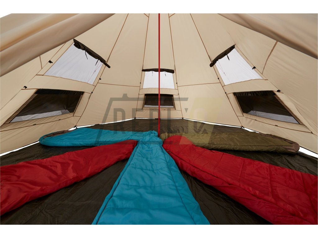 Velké týpí z polyesterové stanovky s atypickou centrální ocelovou tyčí, lehké, snadno transportovatelné, jednoduchá stavba.