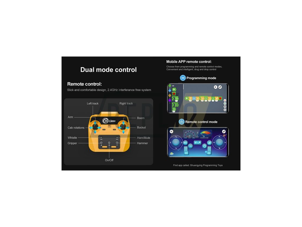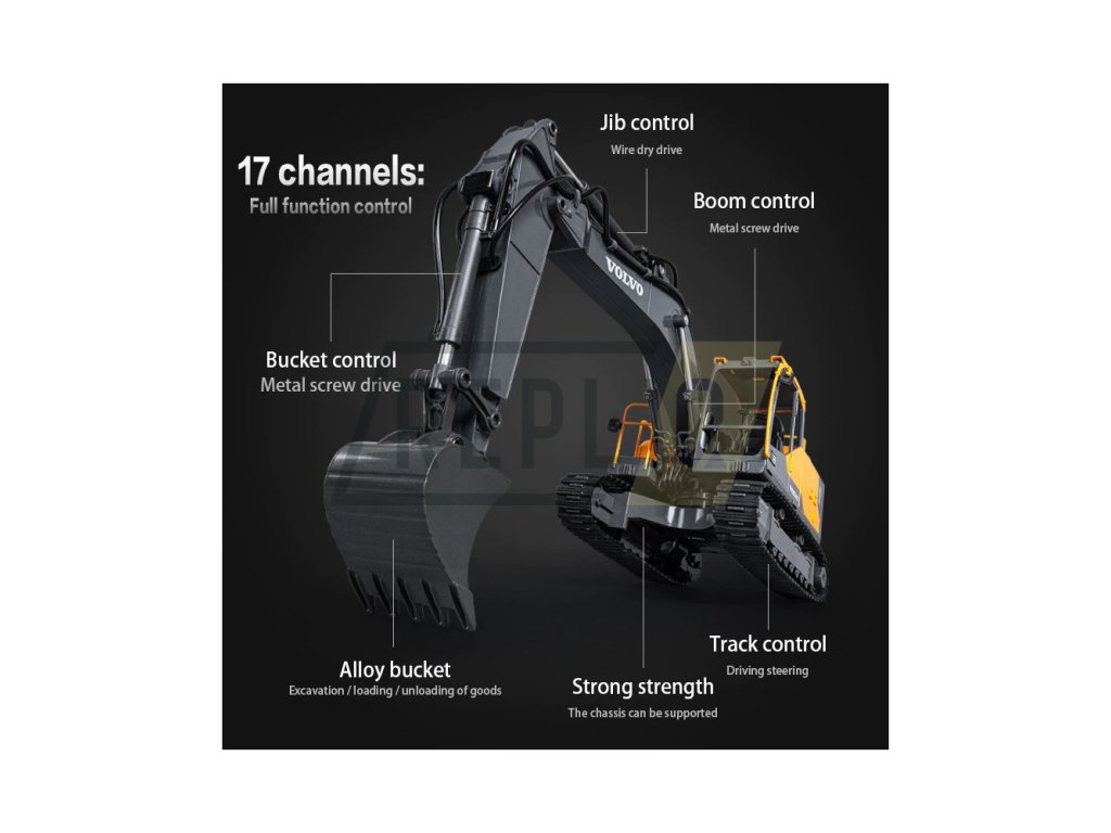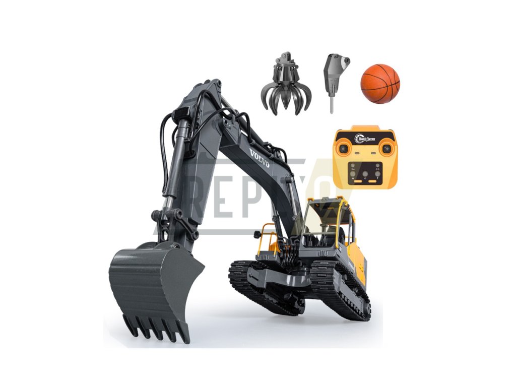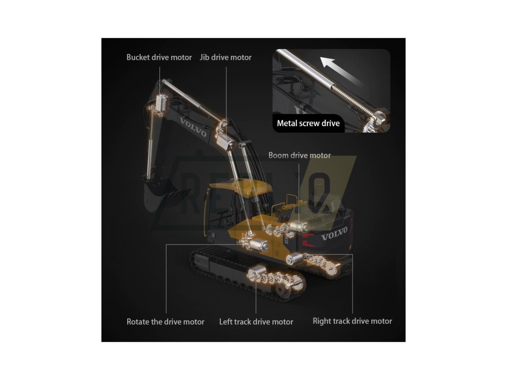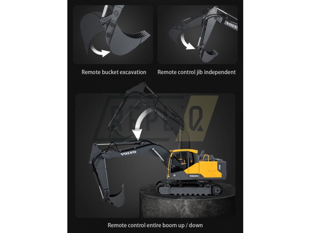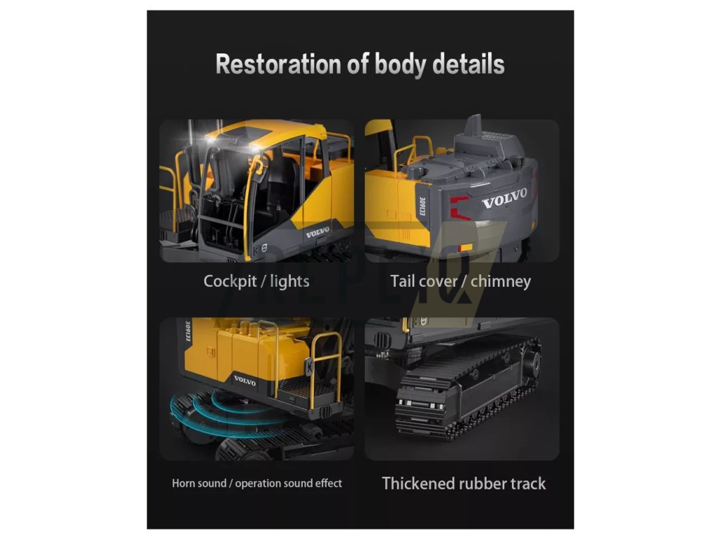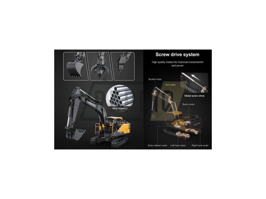 Jedná se o vylepšenou verzi. Díky novým kovovým prvkům včetně převodů je toto rypadlo odolné, zatímco jeho lehké tělo je dodáváno s odolným ABS plastem. Podvozek je vyroben z plastu, ale mají vynikající odolnost, protože je dvouvrstvý pro ochranu v náročných podmínkách. Nová verze RC rypadel Volvo je postavena s mnoha kovovými prvky, včetně systému kovového šroubového pohonu výložníku/lopaty. Tento bagr je také vybaven protizávažím instalovaným na zadní straně pro skvělé vyvážení - to vše je poháněno dvěma výkonnými motory. Inteligentní konstrukce rypadla umožňuje více zábavy a to i díky přidáním vyměnitelných nástrojů: drapák a bourací kladivo. Model je vybaven pracovními světly a zvuky, díky nimž se budete cítit jako v autentickém stroji Volvo! Užijte si více zábavy se systémem duálního ovládání: aplikace pro telefon obsahuje systém ovládání drag and drop, který umožňuje plánovat a provádět sekvence pohybů - to je docela cool, co myslíte!