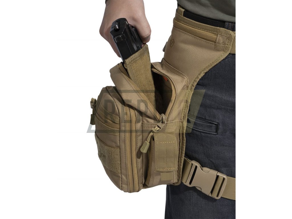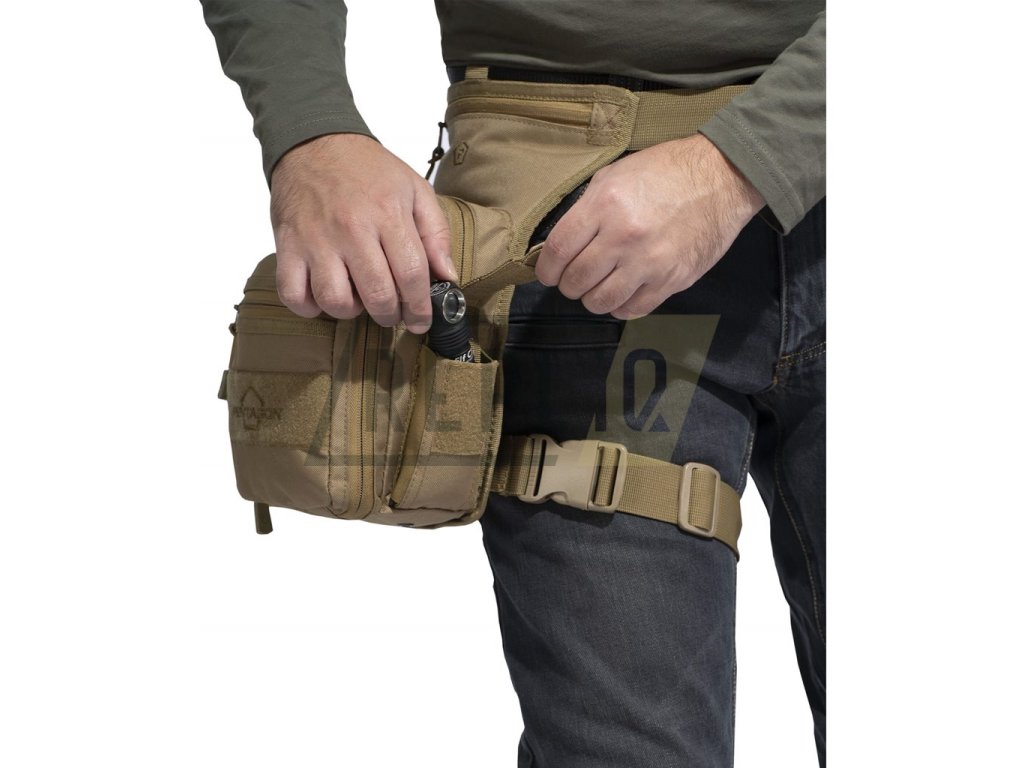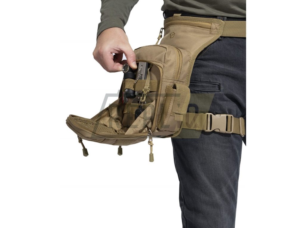 Stehenní pouzdro MAX-S 2.0 na skryté přenášení zbraně a vybavení od řeckého výrobce PENTAGON. Pouzdro je ke stehnu fixováno pomocí dvou nastavitelných širokých pásků zapínaných FASTEX přezkami. Na boku pouzdra naleznete dvě sumky na zásobníky uzavírané pomocí chlopní na suchý zip. Pouzdro je dělené na dvě části. Přední část je opatřena VELCRO panelem na nášivky, malou plochou kapsou uzavíranou zipem, vnitřní síťovanou kapsou, dvěma řadami MOLLE/PALS vazby a malou plastovou karabinkou. Zadní kapsa je prostorná, pojme zbraň kompaktní velikosti či dva puškové zásobníky. Poslední kapsu naleznete v horní části pouzdra, ta je vhodná na uložení cenností jako jsou peníze či doklady, případně do ní můžete vložit zbraň služební velikosti.