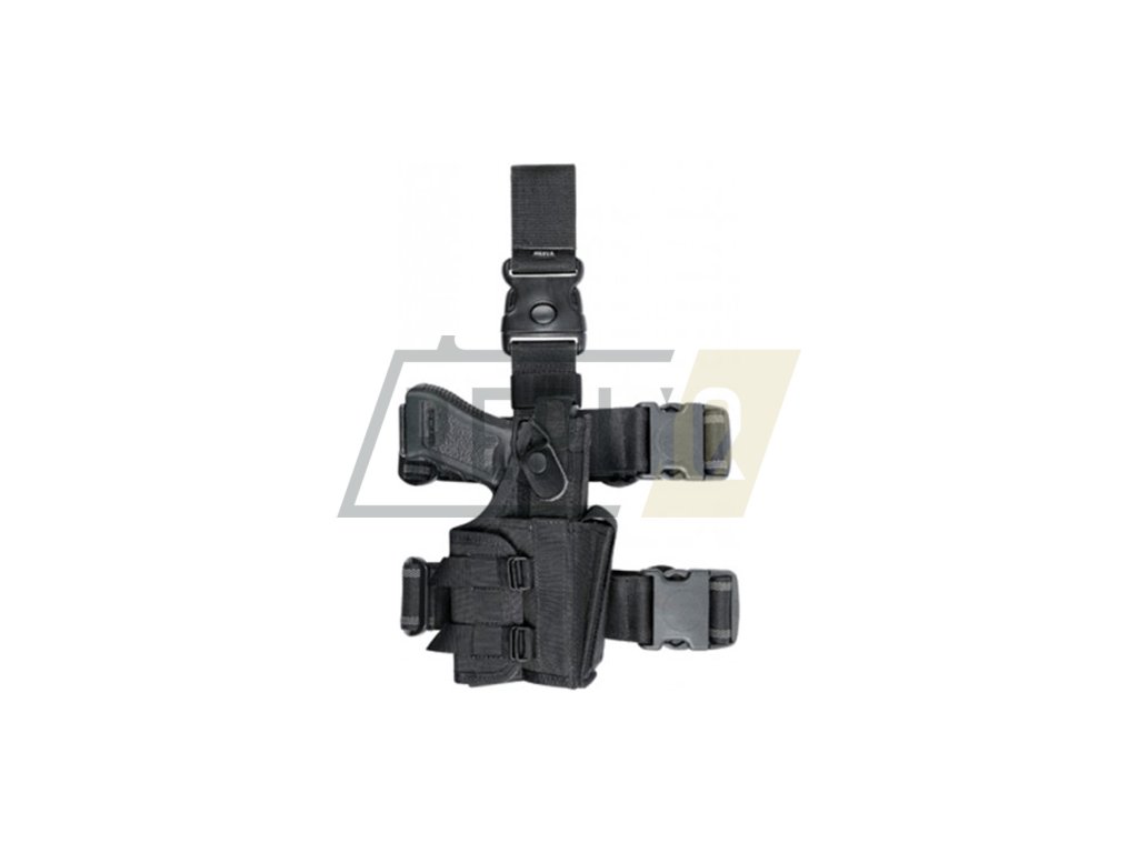 - Nylonové taktické pouzdro bez krycí chlopně s pouzdrem na zásobník. 2 nastavitelné pásky pro bezpečné uchycení na stehno, trojí jištění zbraně v pouzdru - dva pásky přes zadní část závěru, parapojistka přes pažbičku - gumová šňůrka s drukem - možno použít libovolné množství zajištění dle povahy akce.