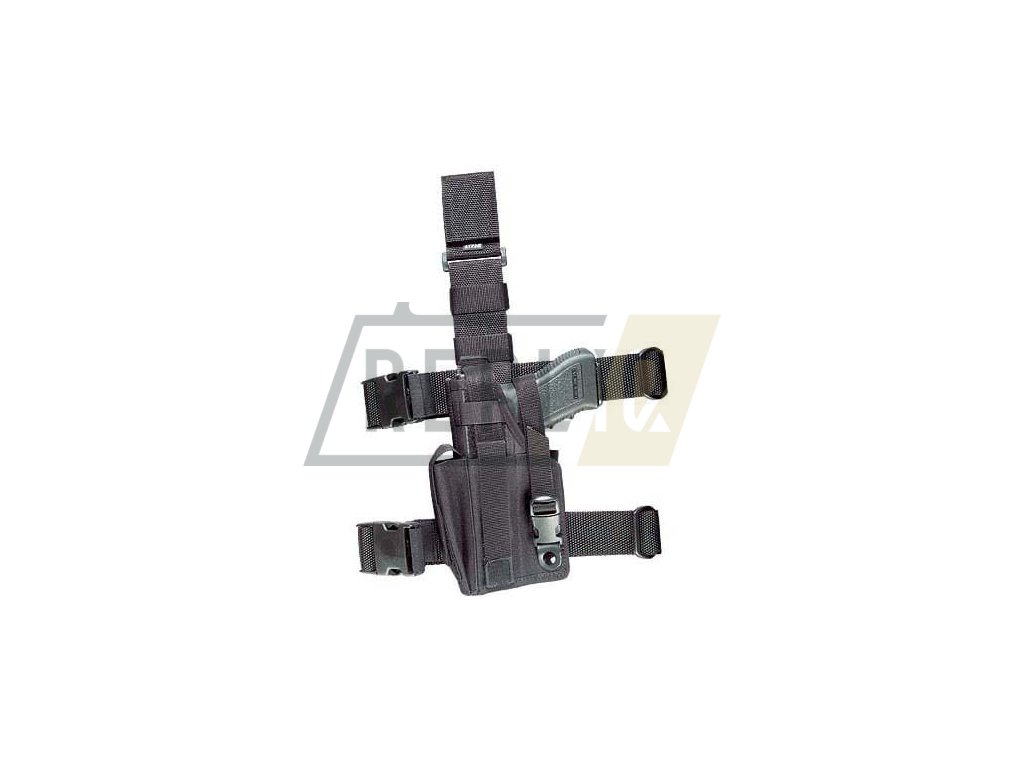 Taktické stehenní pouzdro Dasta 651/TZ-PARA bez krycí chlopně s kapsou na zásobník. Pouzdro připevníte pomocí dvou pružným pásů, s velmi pevnou plastovou sponou, na stehno. Vrchní spona udržuje pouzdro, ve Vámi požadované výšce, na opasku. Zbraň v pouzdře drží přes rukojeť rychle odepínatelná plastová spona a přes konec závěru spona ocelová.