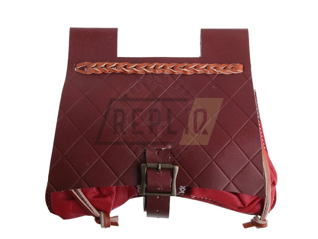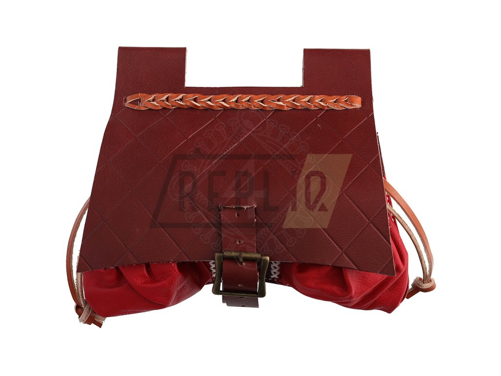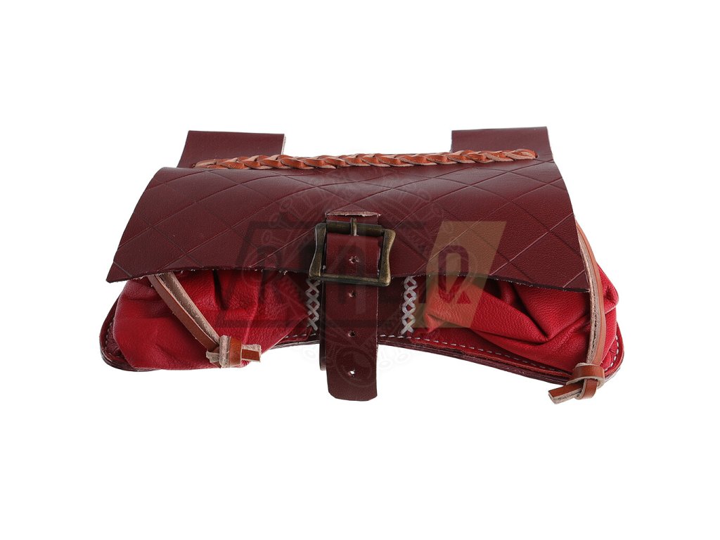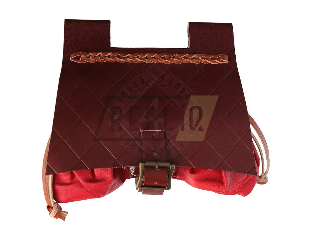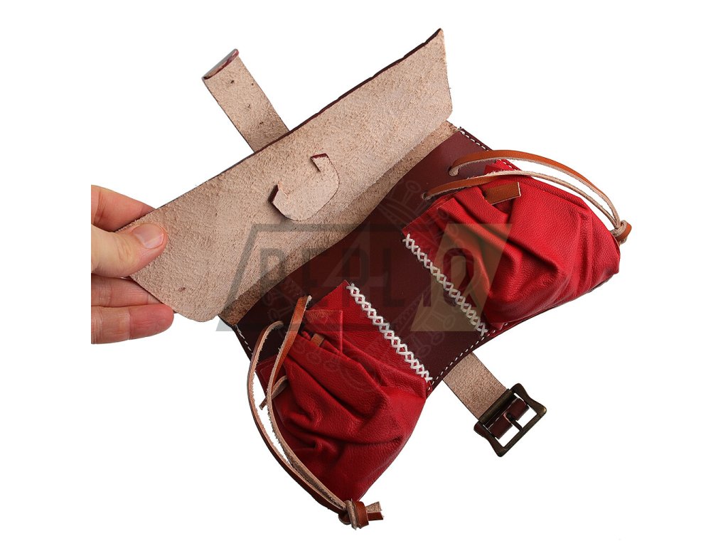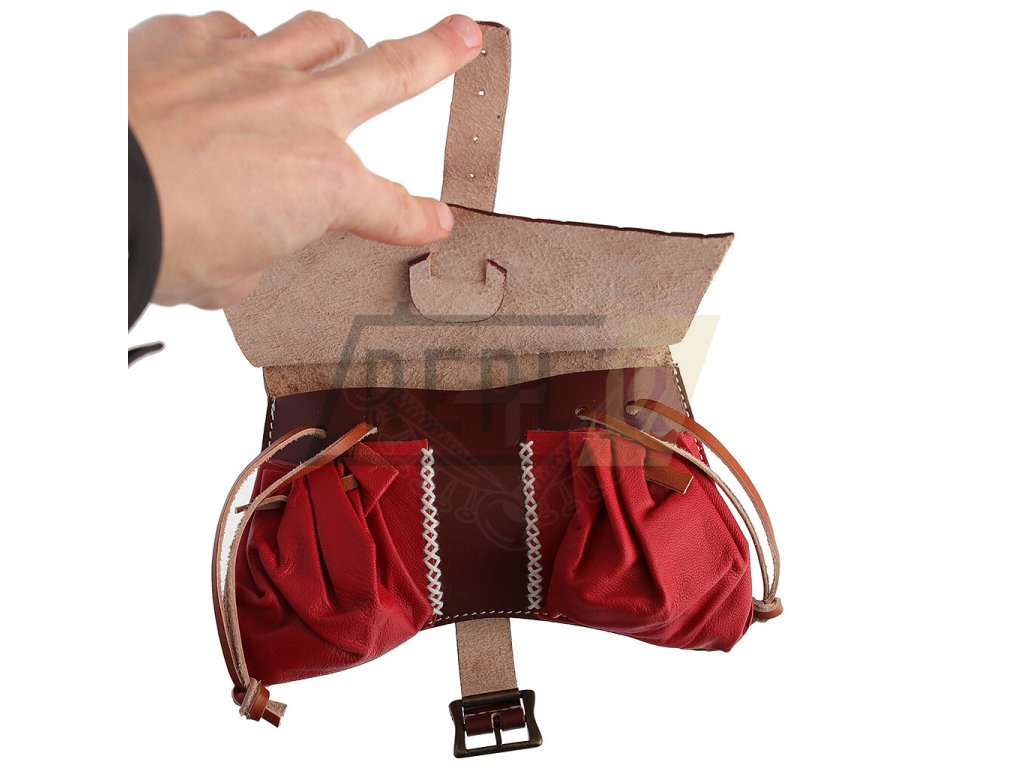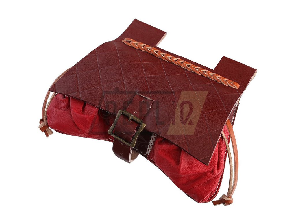 Středověká opasková brašna s integrovanými měšciOpasková brašna je vyrobena z hnědé a červeně barvené vysoce kvalitní hovězí kůže.
