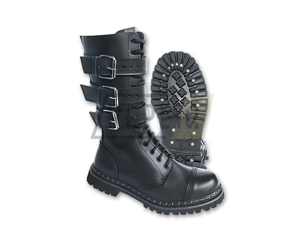 Kvalitní, pevná, vysoká obuv s ocelovou špičkou. Ražená pata, pevné švy, 14 šněrovacích dírek, 3 přezky. Šroubovaná, lepená a prošitá profilovaná podrážka. Materiál: pravá kůže.