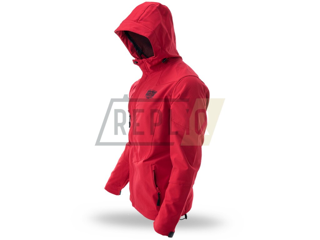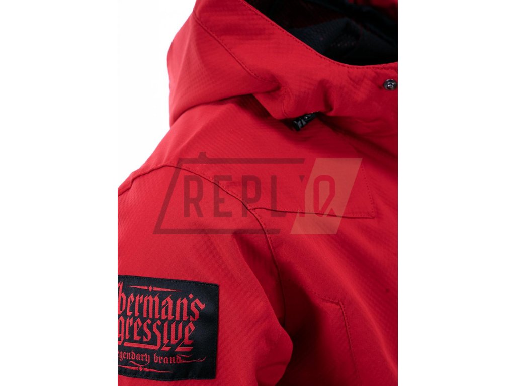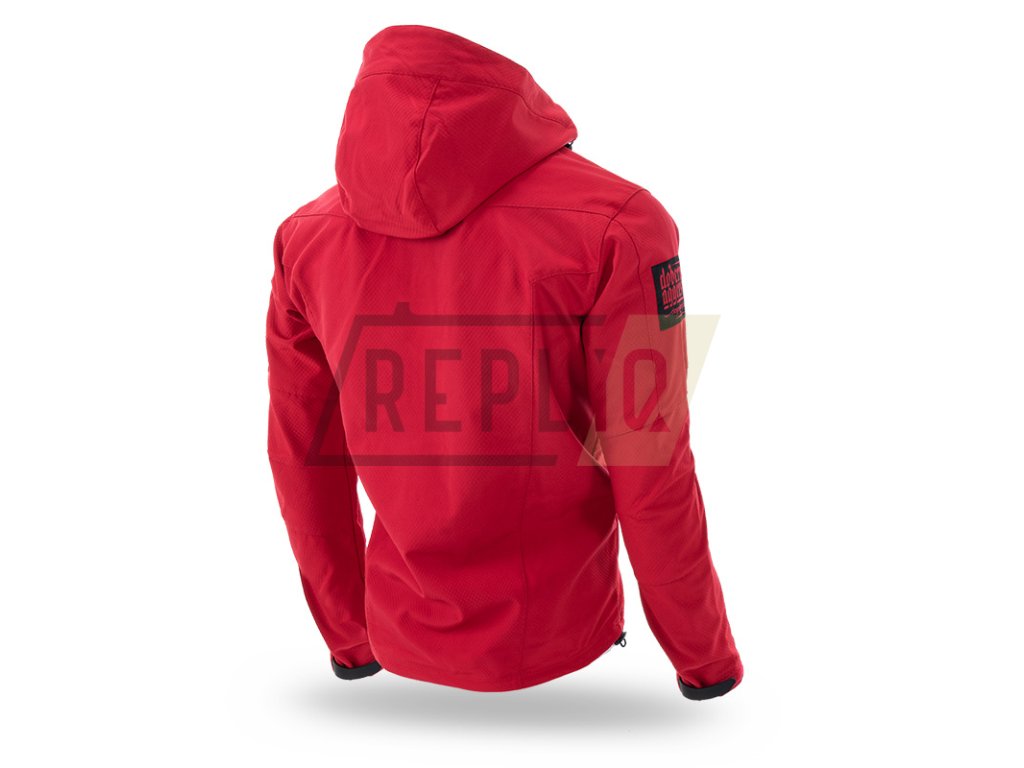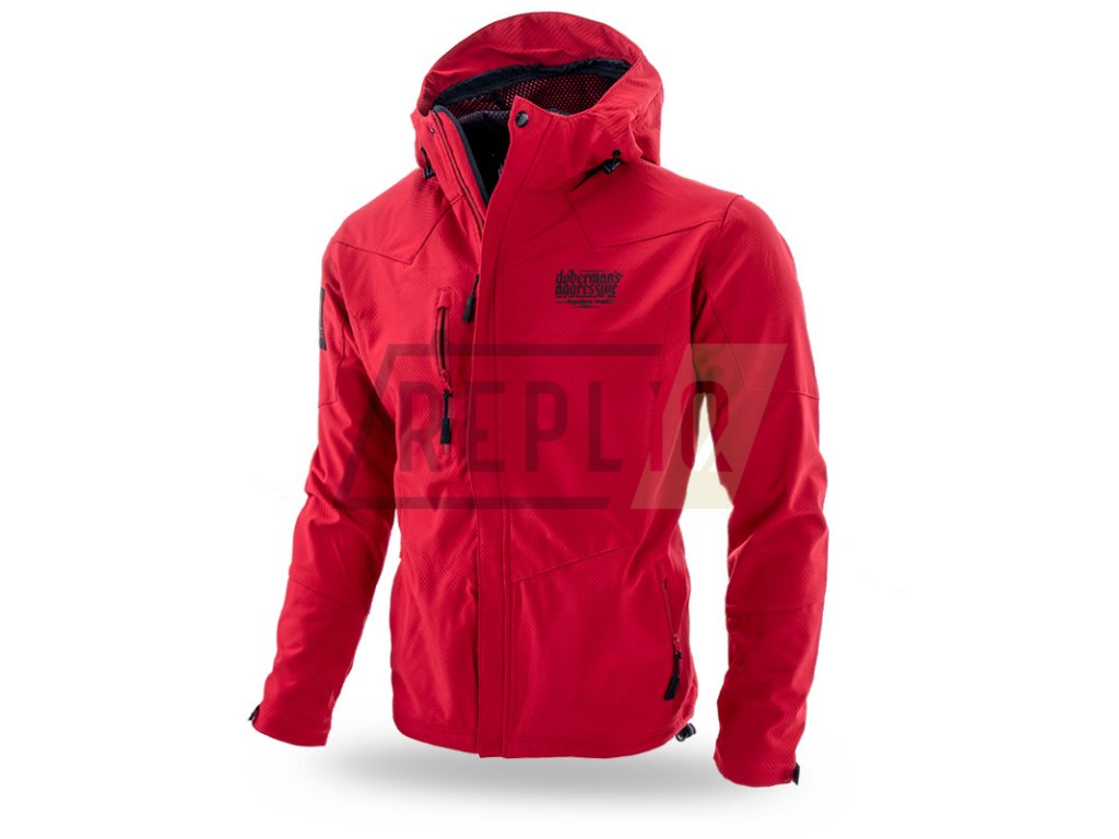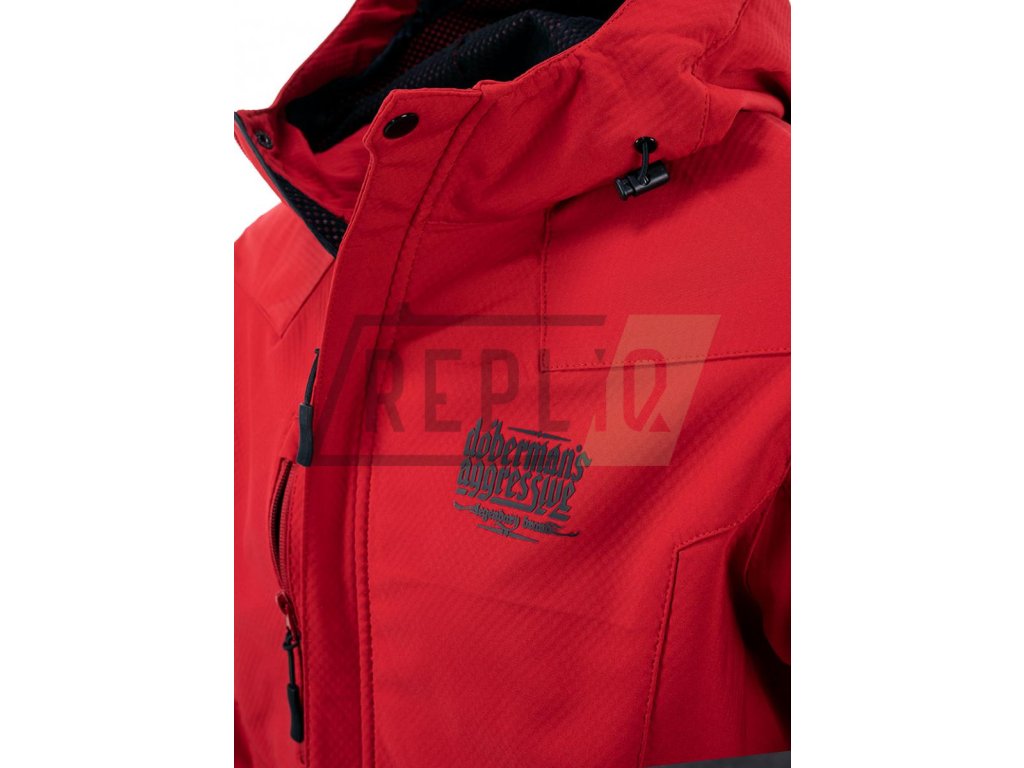 Proti větru odolný a voděodolný vzorec Softshell umožňuje nosit ji za různých povětrnostních podmínek. Standardní střih s vysokým límcem, který přechází v pohodlnou kapuci s dodatečnou ochranou proti dešti. Možnost nastavení bundy díky gumovým šňůrkám v dolní části a u kapuce, a také suchým zipům u rukávů. Bunda se zapínáním na zip, má dvě kapsy na zapínání na bocích a jednu na hrudi. Rukáv je zdobený velkou nášivkou s logem značky. Na hrudi je 3D potisk se symbolem Doberman’s Aggressive.