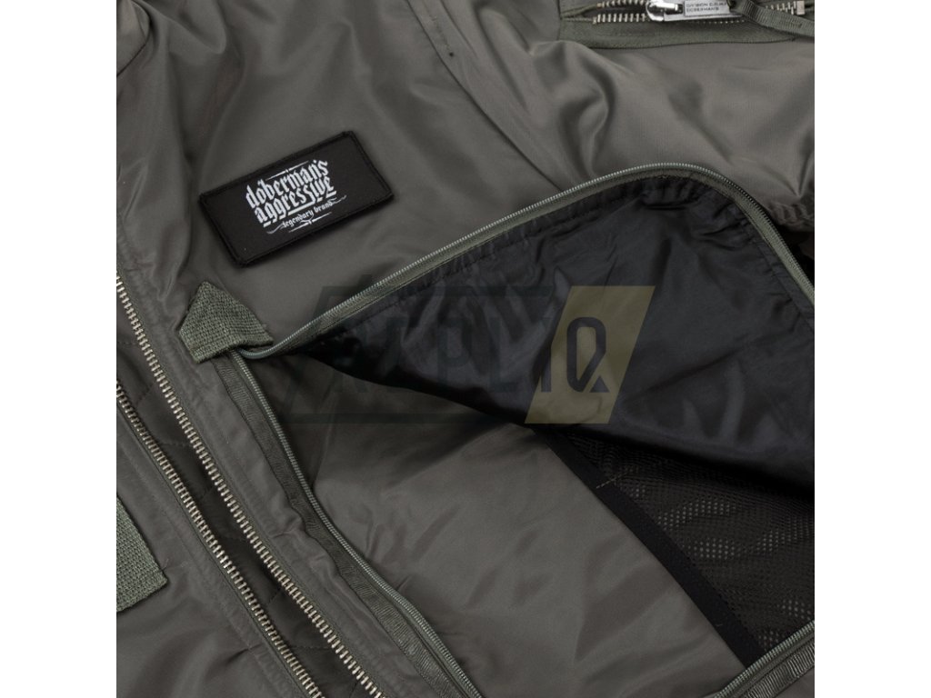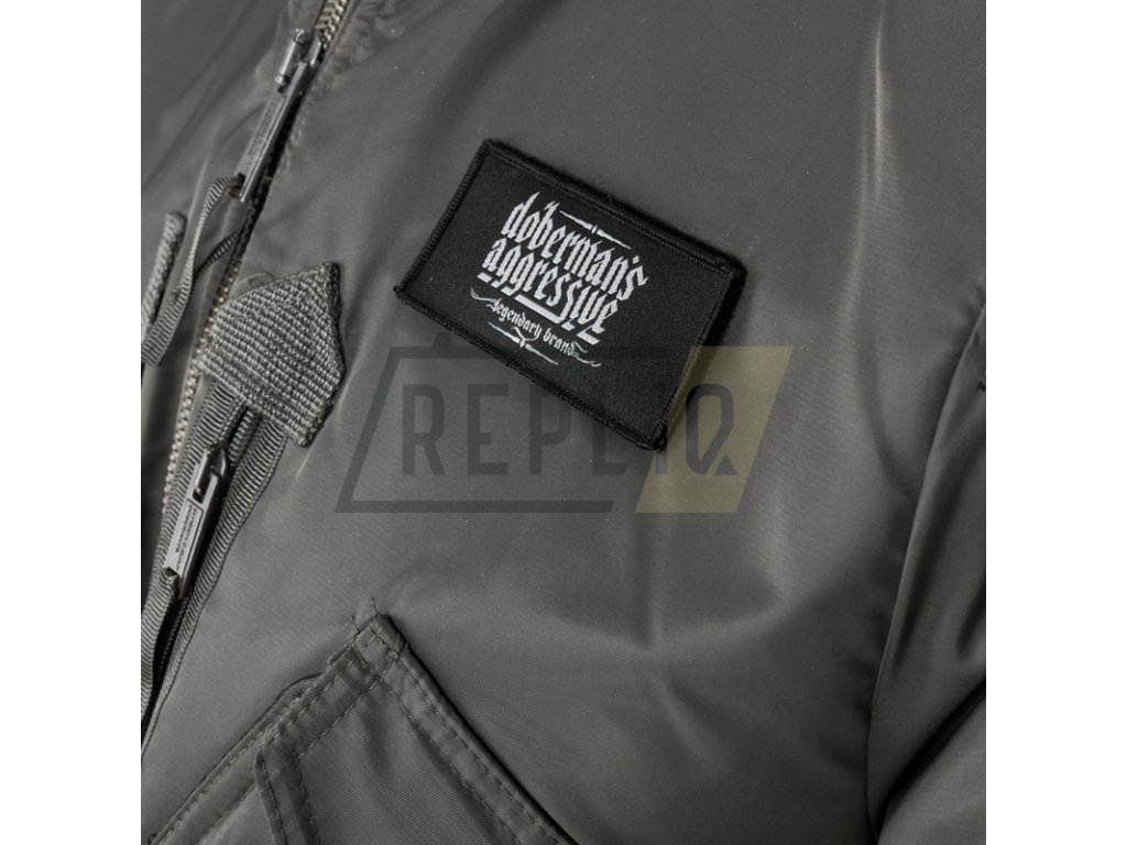 Na levém rukávu kapsa se zipem a červeným přívěškem OFFENSIVE. Na přední straně je velká kapsa na zip a dvě menší kapsy se zapínáním na suchý zip. Na levé straně hrudi je vyšívaná nášivka na suchý zip s logem Dobermans Aggressive.