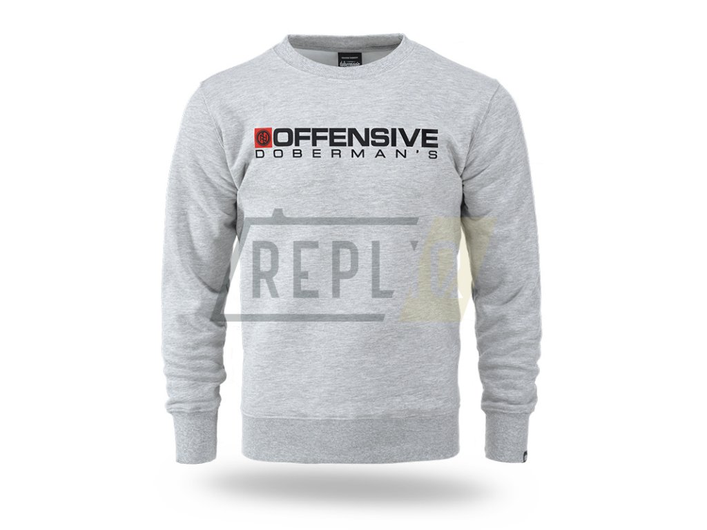 Na levém rukávu je našitá malá cedulka s logem značky. Dolní část mikiny a rukávů je zakončená širokým stahovacím lemem. Na přední straně mikiny je jednoduchý nápis OFFENSIVE s nápisem DOBERMANS pod ním. Celý vzor je doplněný severským symbolem, který je vepsaný do tvaru čtverce.