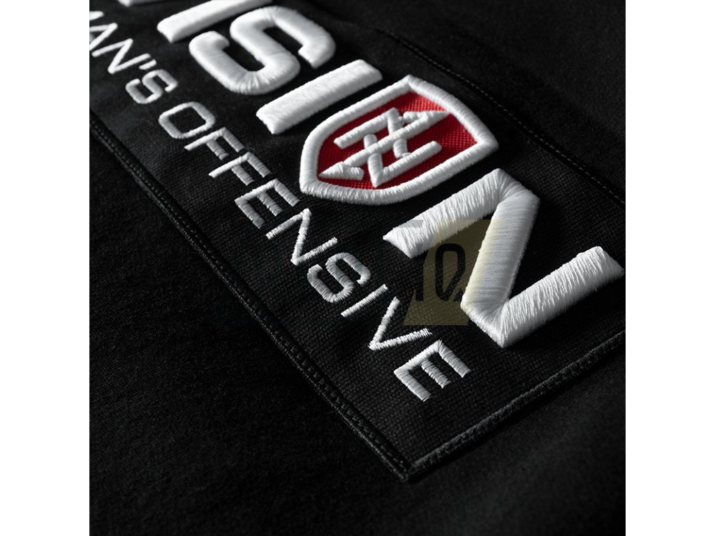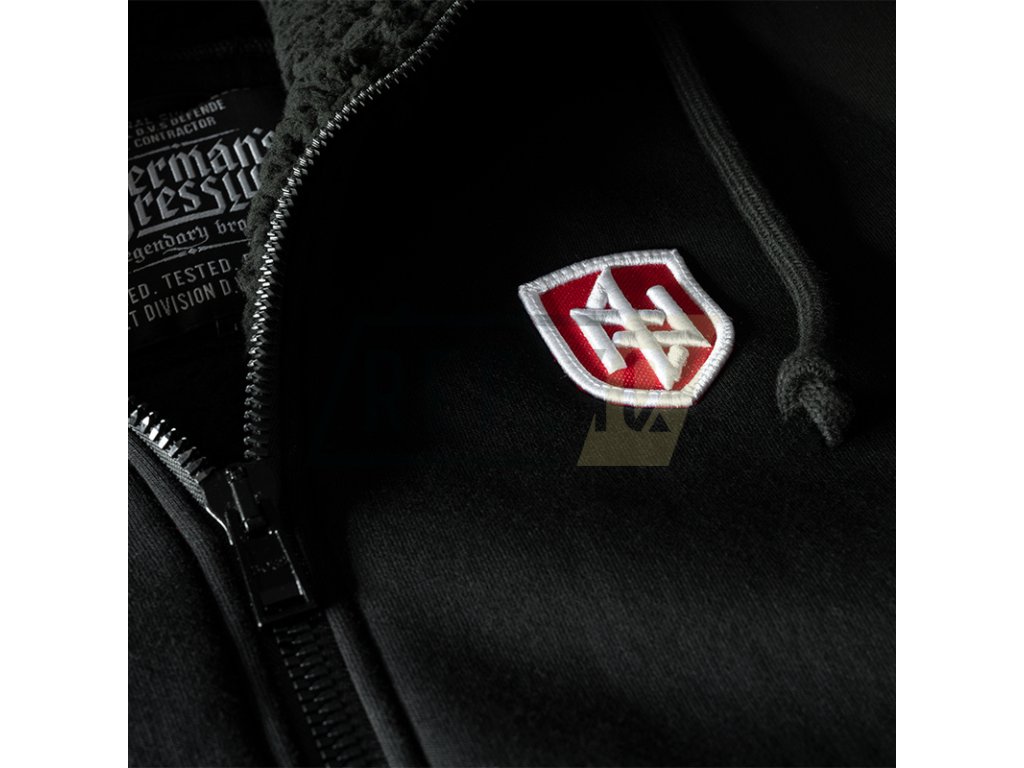 Zvýšený límec přechází do prostorné, zateplené kapuce. Oděv je vyroben z vysoce kvalitní bavlny. Na levé straně hrudníku mikiny je nápis „Valhalla Rising“. Zadní část je z velké části pokryta potiskem s vyobrazením napůl klečícího Vikinga opírajícího se o meč. V pozadí je vidět flotila lodí na moři. Grafika čerpá ze skandinávských motivů.
