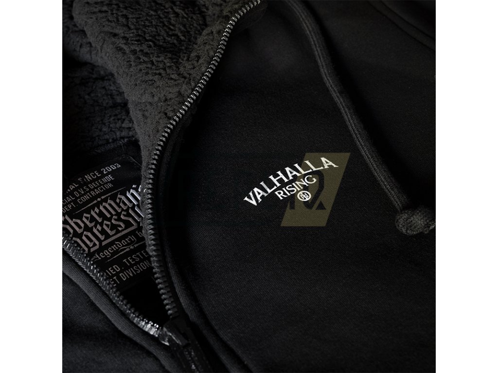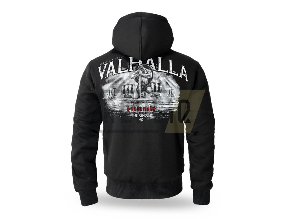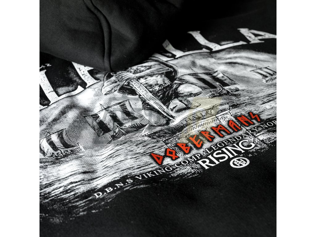 Zvýšený límec přechází do prostorné, zateplené kapuce. Oděv je vyroben z vysoce kvalitní bavlny. Na levé straně hrudníku mikiny je nápis „Valhalla Rising“. Zadní část je z velké části pokryta potiskem s vyobrazením napůl klečícího Vikinga opírajícího se o meč. V pozadí je vidět flotila lodí na moři. Grafika čerpá ze skandinávských motivů.