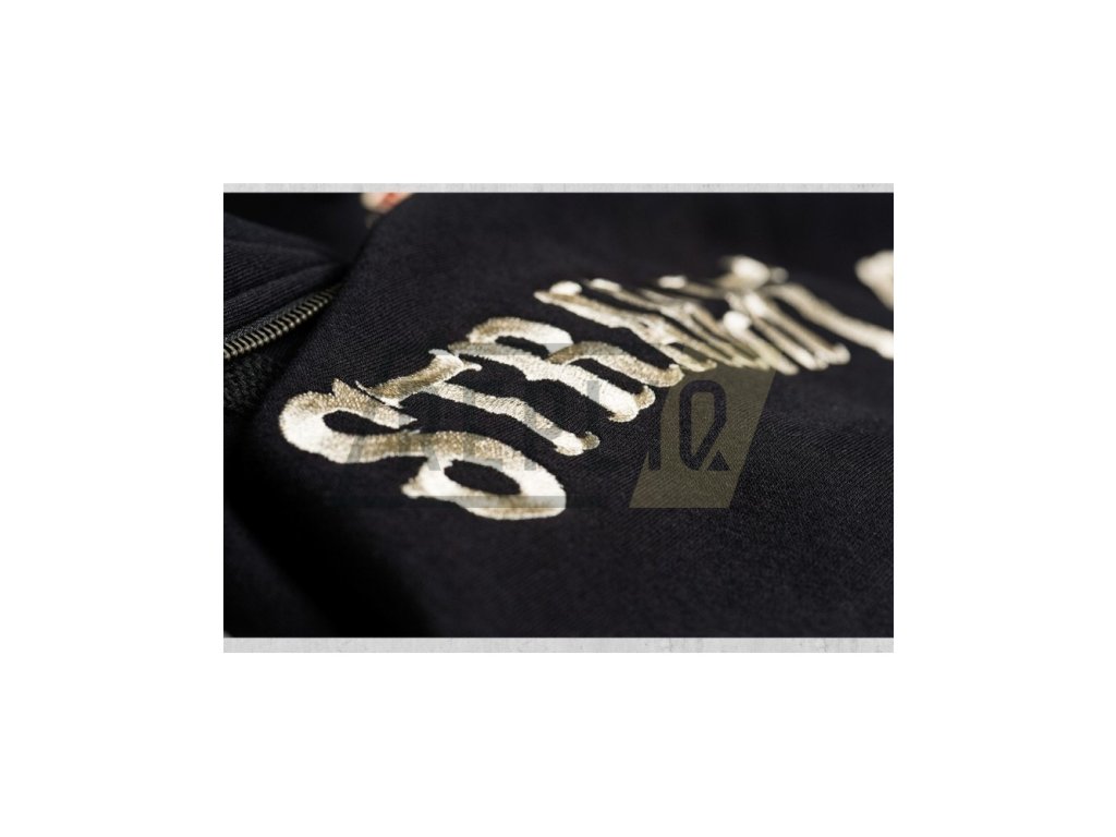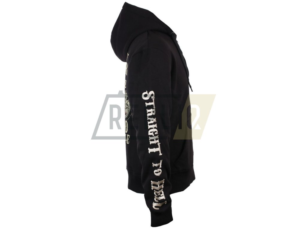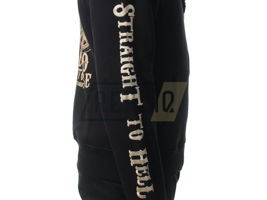 ČERNÁ MIKINA NA ZIP S POTISKEM DESIGNU EL DIABLO, VYŠITÝM KŘÍŽEM NA HRUDI A VELKOU VÝŠIVKOU STRAIGHT TO HELL NA PRAVÉM RUKÁVU.
