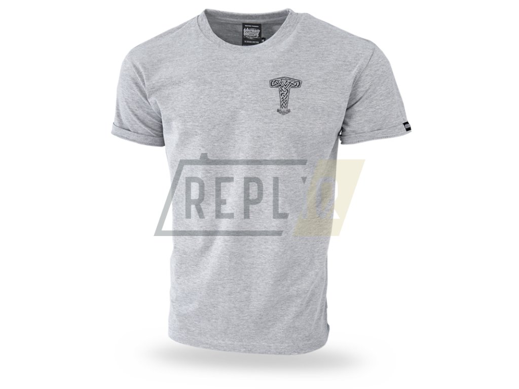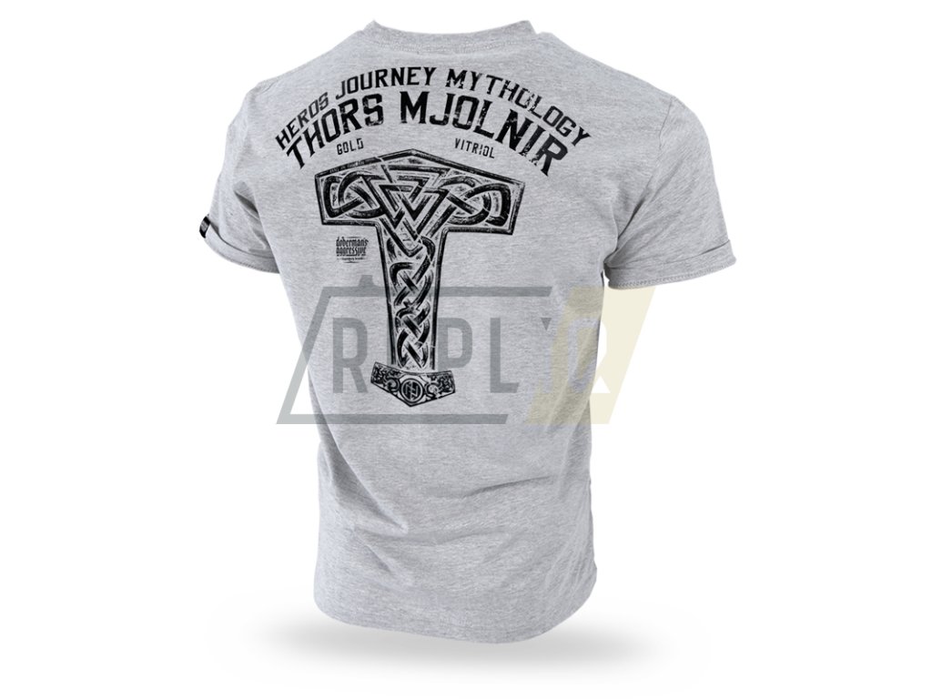 Pánské tričko klasického střihu. Vyrobeno z vysoce kvalitní bavlny. Na levém rukávu je všitá malá cedulka s logem značky. Na zádech je vzor, který zobrazuje Thorovo kladivo s nápisem HEROS JOURNEY MYTHOLOGY THORS MJOLNIR a logo Doberman’s Aggressive. Na levé straně hrudi je miniatura vzoru Thorova kladiva.