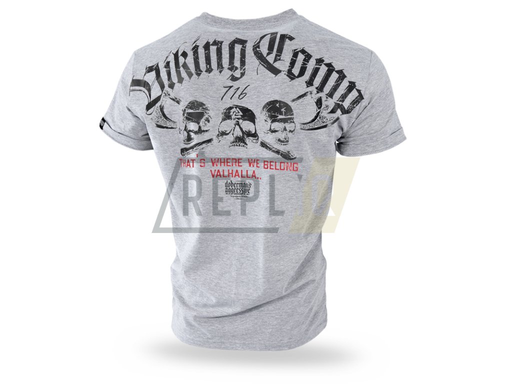 Pánské tričko klasického střihu. Vyrobeno z bavlny o velmi vysoké hmotnosti. Na levém rukávu je všitá malá cedulka s logem značky. Na zádech je dvojbarevný vzor s nápisem Viking Comp, třema lebkami a sekerami a nápisem „That’s where we belong Valhalla”. Vpředu na levé straně hrudi je miniatura vzoru, který se nachází na zadní straně trička.