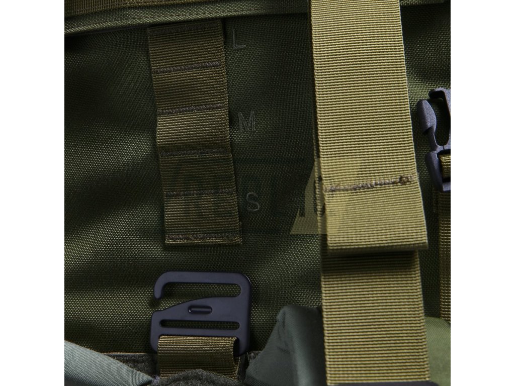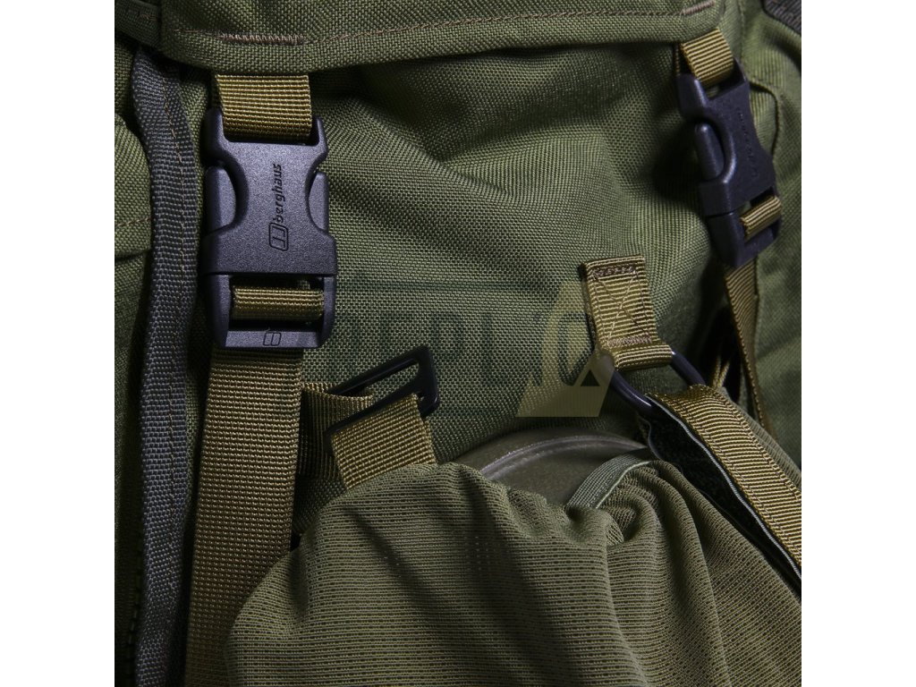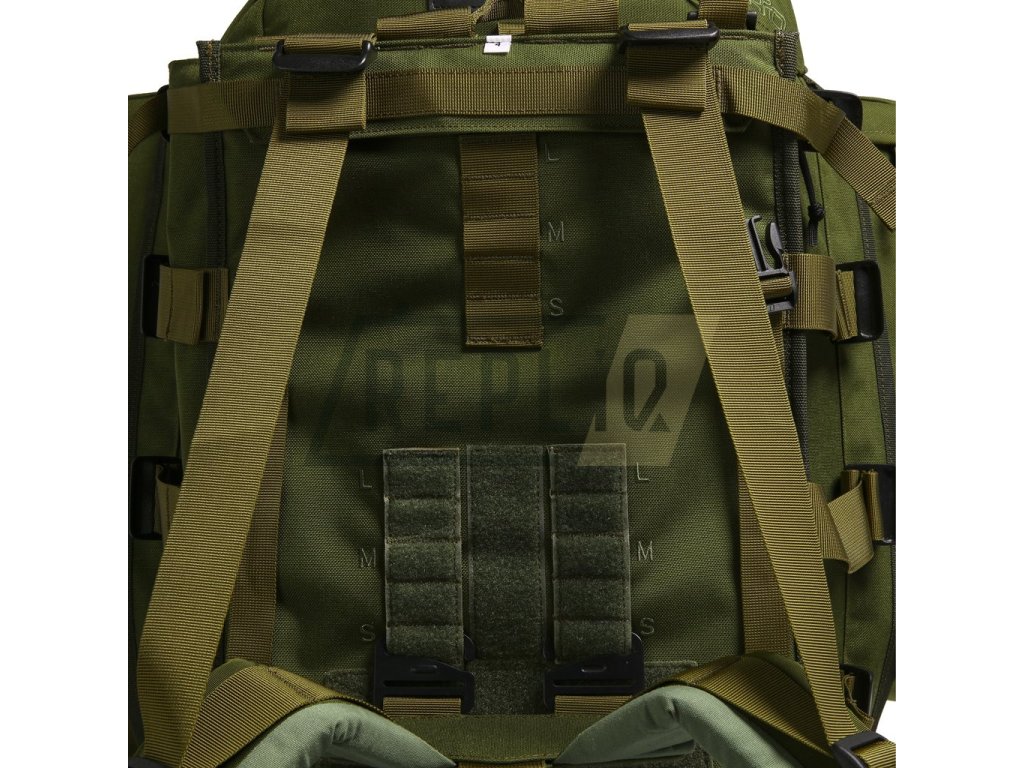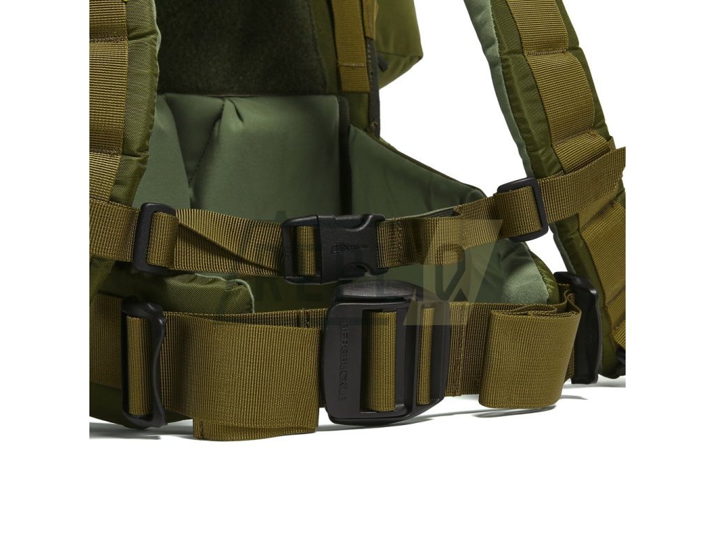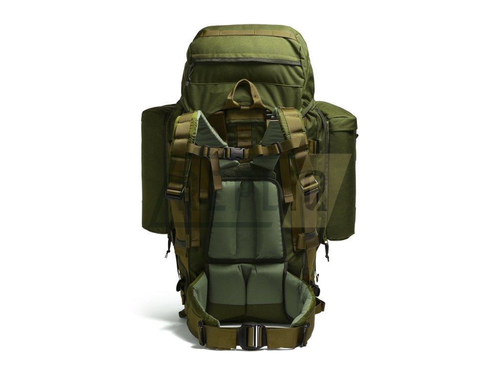 Ramenní popruhy jsou masivně polstrované, pokryté syntetickou tkaninou a opatřené elastickým hrudním popruhem s možností výškového nastavení. Bederák je také silně polstrovaný a spíná se pomocí tiché plastové přezky typu Bergbuckle. Záda batohu jsou zpevněna hliníkovou konstrukcí a disponují segmentovým polstrováním se zachováním středového kanálku pro odlehčení páteře. Celý nosný systém je možné výškově nastavit pomocí kovových průvleků v celkem pěti polohách. V zádech je integrováno pouzdro určené na přenášení dlouhé zbraně se zesílením v dolní části. Na bocích batohu naleznete odepínatelné kapsy o celkovém objemu 20 litrů, které je možné sepnout a vytvořit tak nouzový batoh. Pod kapsami se nachází dodatečné kompresní popruhy spínané přezkou.