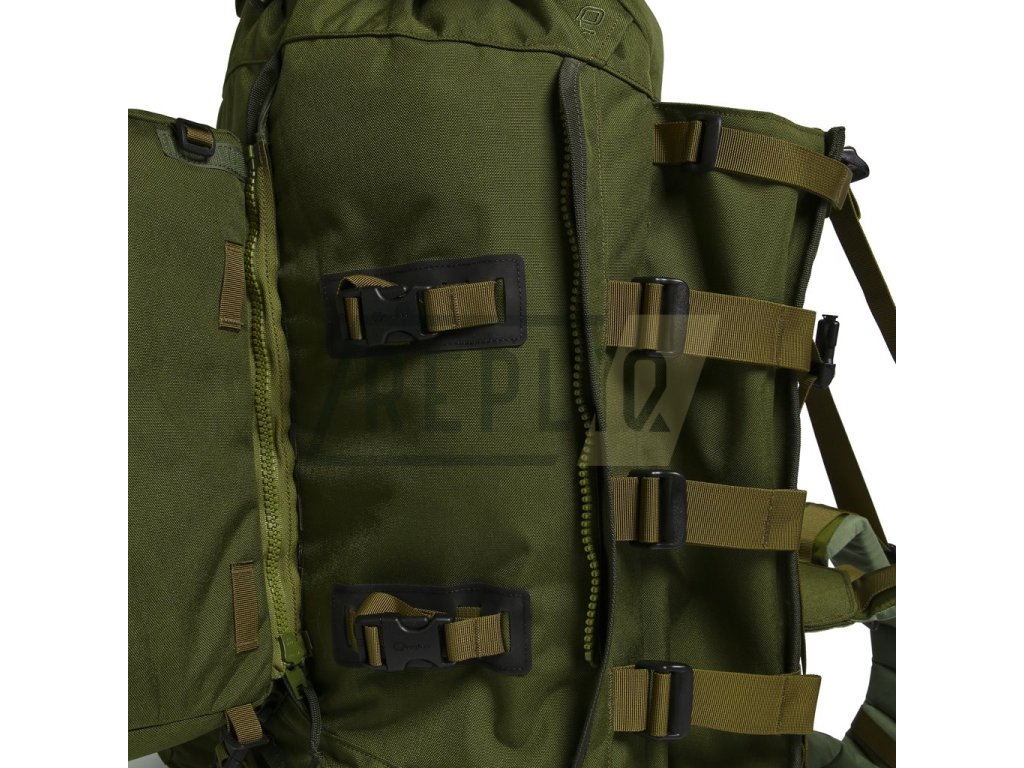 Na čelní části batohu naleznete hned několik textilních a plastových průvleků na přichycení vybavení jako jsou cepíny a sekery. K dispozici je i modulární vazba standardu MOLLE/PALS pro kompatibilní pouzdra, sumky a další podobné vybavení. K plnění batohu můžete využít spodního plnění, předního FA přístupu skrze chlopeň se zipem a klasického horního / komínového plnění. Horní plnění batohu je kryté víkem s modulární vazbou a integrovanou kapsou.