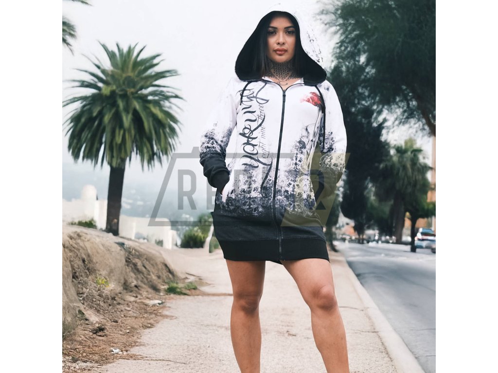 Dámská mikina na zip YAKUZA CURTAIN. Tato dlouhá mikina na zip je ideální pro ležérní styling: Není příliš úzká, ani příliš volná, je tak akorát. Má dvě přední kapsy, kapuci se stahovací šňůrkou a žebrovaný lem a manžety. Mikina má také celoplošný potisk, logo Yakuza na bočním švu a gumovou nášivku s logem u lemu. Prosím, řiďte se níže uvedenými specifikacemi velikostí a pokyny k praní.