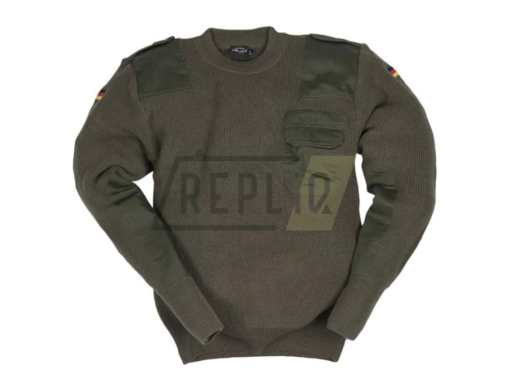 Zelený vlněný svetr vyrobený dle vzoru svetru Bundeswehru používaného německou armádou. Složení s větším poměrem vlny zaručuje trvanlivost, kvalitu a hřejivost.