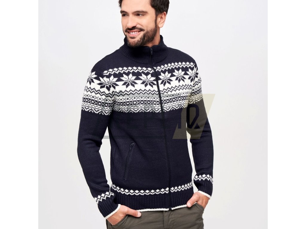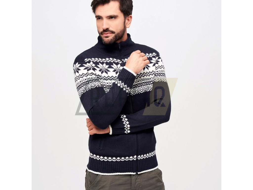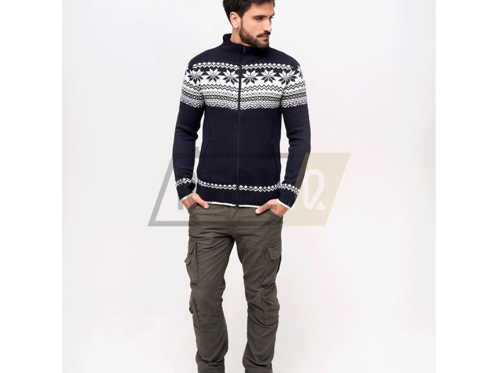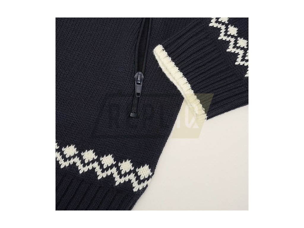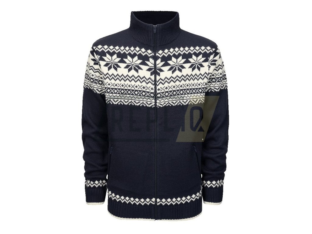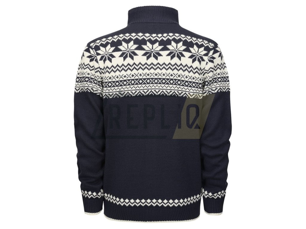 Stylový svetr klasického skandinávského vzhledu. Svetr nabízí neškrábavý hřejivý materiál doplněný o měkkou fleecovou podšívku v oblasti límce. Zapíná se pomocí dlouhého kovového zipu. Kapsy na ruce se zapínají pomocí zipu. Rukávy, spodní lem a límec svetru jsou zakončeny elastickým úpletem.