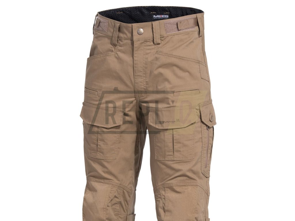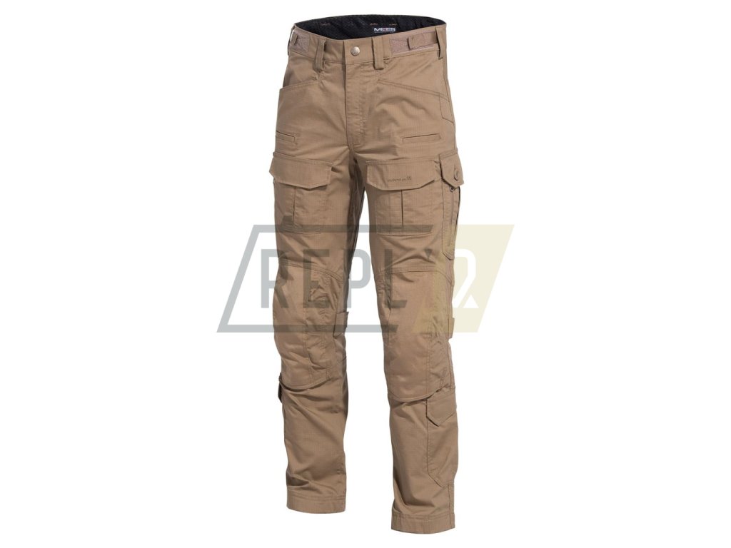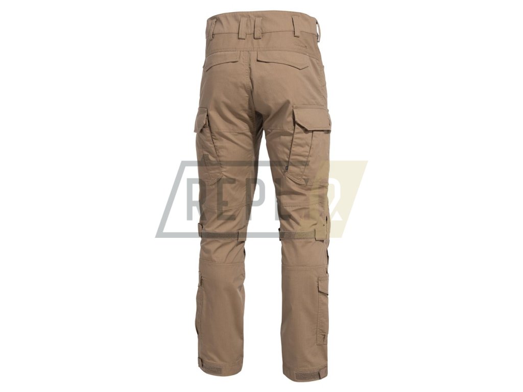 Taktické kalhoty vyrobené z odolného, dvoucestně strečového směsného materiálu v rip-stop úpravě, který disponuje teflonovou povrchovou úpravou. Kalhoty se zapínají kombinací druku, skrytého knoflíku a klasického zipu. Velikost kalhot v pase se dá dodatečně upravovat pomocí pásků se suchým zipem. Opasková poutka kalhot a oblast sedu jsou zesílené.