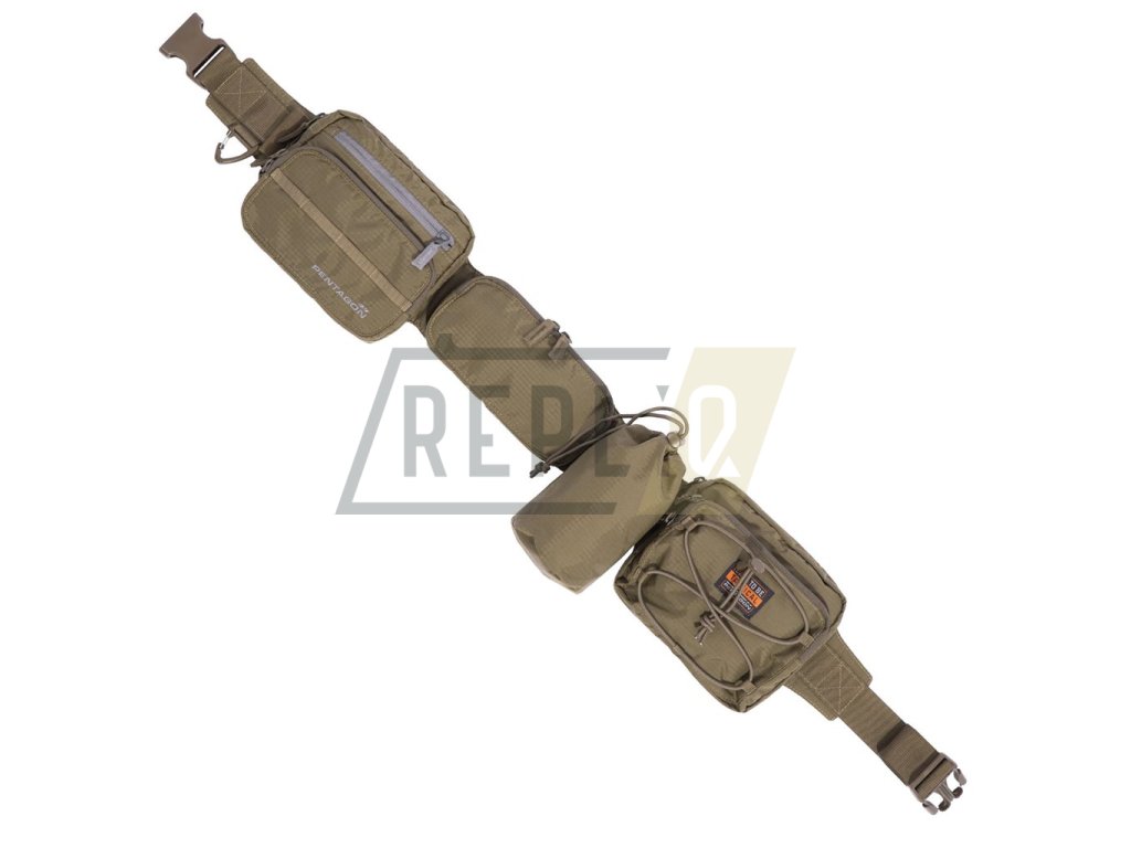 Nastavitelný opasek doplněný o čelní a zadní pouzdro, odnímatelné pouzdro na láhev a kapsu určenou na přenášení brýlí. Čelní pouzdro je opatřené úzkou vazbou pro připevnění dodatečného vybavení, menší plochou kapsou přístupnou skrze zip a hlavní kapsou obsahující praktický organizér. Zadní pouzdro disponuje dvojicí kapes a čelním elastickým šněrováním. Boční pouzdro na láhev má horní stahování se šňůrou a brzdičkou, pojme láhve do 19 cm výšky. Poslední uzavíratelná kapsa je podšita jemným flaušem, je tak perfektní na přenášení brýlí, telefonu či podobně rozměrné výbavy. Opasek je z vnitřní strany opatřen pot odvádějící podšívkou a je možné jej délkově nastavit do velikosti 5XL.