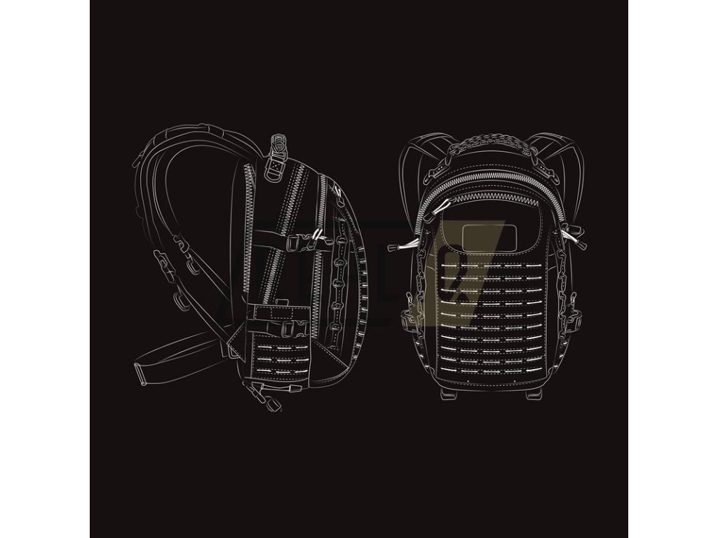Na čelní straně batohu se nachází panel laserem vyřezávané PALS/MOLLE vazby pro možnost připevnění kompatibilních pouzder, panel suchého zipu o rozměru 10 x 5 cm pro umístění velcro nášivek, logo Direct Action a zipem uzavíraná kapsička podšitá měkkým flaušem pro uložení brýlí, telefonu nebo jiných drobností náchylných na poškrábání.