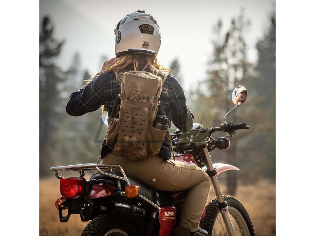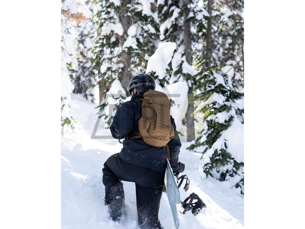 Již na první pohled na přední straně batohu zaujme laserově vyřezávaný MOLLE panel, který připomíná šátek přes ústa, který nosili banditi v dobách Divokého západu. Tento panel umožní uživateli připojit k přední straně batohu prostorově výrazné vybavení, které by jinak zabíralo uvnitř příliš místa. Pod MOLLE panelem najdete chlopeň předního plnění, která je z vnitřní strany pokryta smyčcovou částí suchého zipu a na její vnější straně naleznete VELCRO panel. Víko batohu skrývá organizér vhodný pro drobné věci jako jsou zápisníky, popřípadě zásobník do služební zbraně. Hlavní úložný prostor pak skrývá tři boční kapsy na drobnosti a také jednu velkou plochou kapsu na hydratační vak o objemu dvou či tří litrů. Vak se uvnitř upevňuje pomocí malé přiložené karabinky.