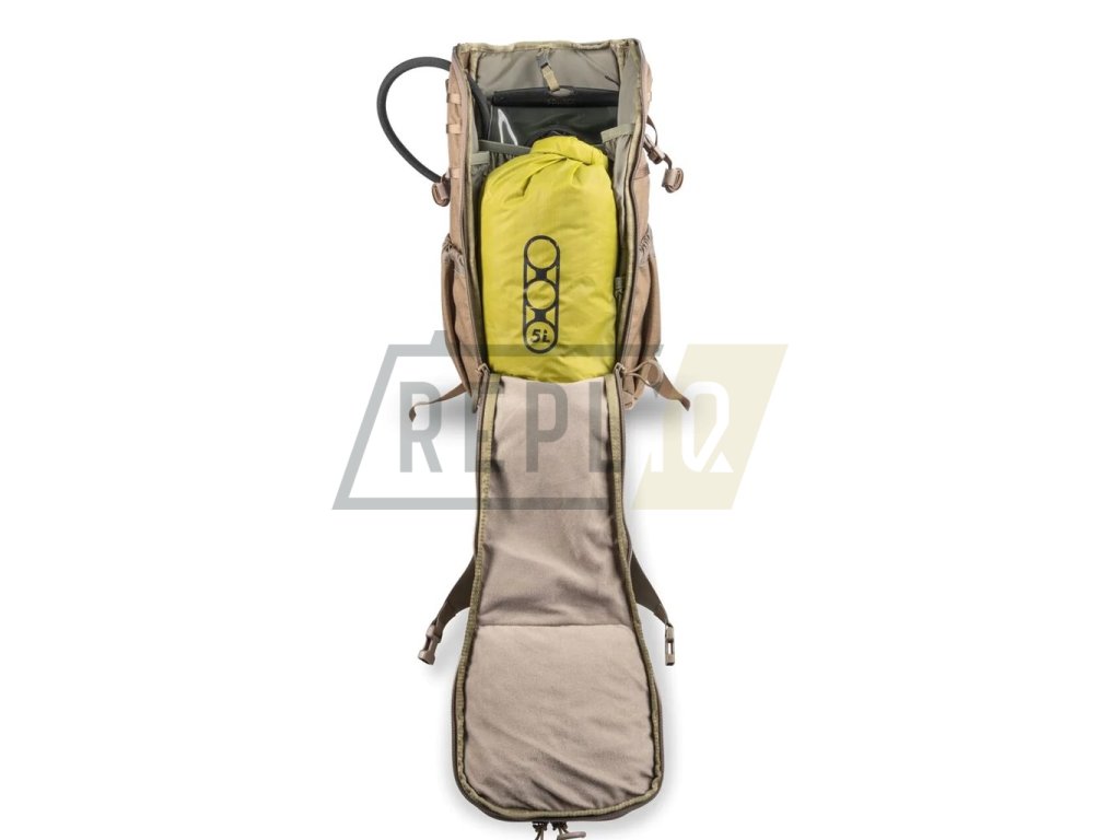 Již na první pohled na přední straně batohu zaujme laserově vyřezávaný MOLLE panel, který připomíná šátek přes ústa, který nosili banditi v dobách Divokého západu. Tento panel umožní uživateli připojit k přední straně batohu prostorově výrazné vybavení, které by jinak zabíralo uvnitř příliš místa. Pod MOLLE panelem najdete chlopeň předního plnění, která je z vnitřní strany pokryta smyčcovou částí suchého zipu a na její vnější straně naleznete VELCRO panel. Víko batohu skrývá organizér vhodný pro drobné věci jako jsou zápisníky, popřípadě zásobník do služební zbraně. Hlavní úložný prostor pak skrývá tři boční kapsy na drobnosti a také jednu velkou plochou kapsu na hydratační vak o objemu dvou či tří litrů. Vak se uvnitř upevňuje pomocí malé přiložené karabinky.