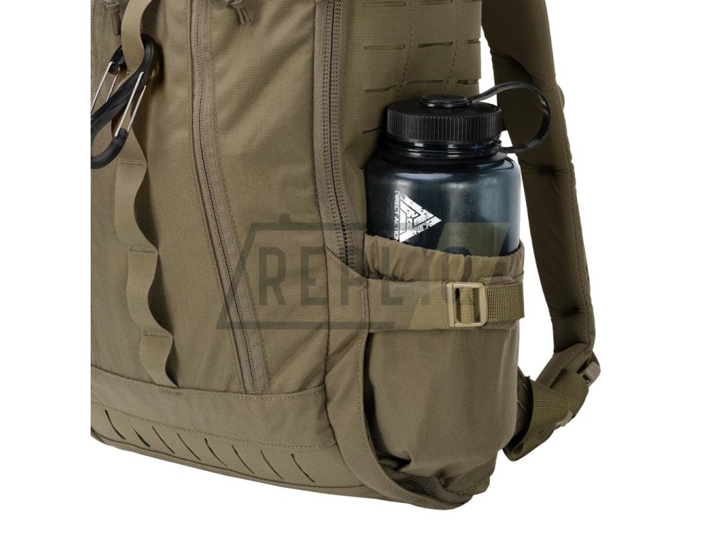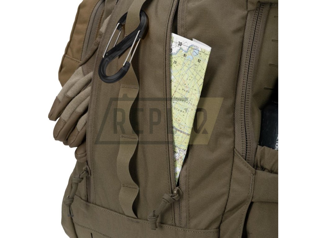 Na bocích se nachází další modulární vazba, v tomto případě doplněná o dvojici kompresních popruhů. V dolní části se nachází dvojice kapes s elastickým okrajem určená pro vložení láhví na vodu, fixaci turistických holí apod. Čelní část tvoří víko umožňující mušlové otevírání batohu. Na víku nalezete dvě ploché kapsy uzavírané pomocí zipů, středový pás tvořený elastickými popruhy, rozměrný panel suchého zipu pro vaše jmenovky či nášivky a dvě menší kapsy přístupné skrze zip. Interiér batohu je podšitý jemným flaušem s možností připevnění dodatečného vybavení.