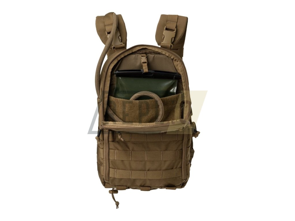 Ramenní popruhy jsou anatomicky zakřivené, silně polstrované, opatřené pruhy MOLLE vazby a pro integraci s taktickou vestou či chest rigem je lze zcela odepnout a nepoužívat. Boky i přední část batohu jsou opatřeny další modulární vazbou MOLLE/PALS, není tak problémem batoh ověsit dodatečným kompatibilním vybavením. Pro umístění jmenovek či nášivek na suchý zip je k dispozici velmi rozměrný panel suchého zipu kombinovaného s modulární vazbou. Na bocích naleznete kompresní popruhy s G háčkem. Dno batohu je opatřené pruženkou s malou plastovou brzdičkou. Tato pruženka je perfektní pro umístění tenké větrovky či podobně rozměrného vybavení. Přední kapsa je plochá a určená k uložení dokumentů. Hlavní úložný prostor je přístupný skrze dvoucestný zip s táhly. Uvnitř naleznete přihrádku pro umístění hydratačního vaku, jehož hadičku můžete vyvést v pravé i levé horní části batohu. Vak je fixovaný malou plastovou přezkou.