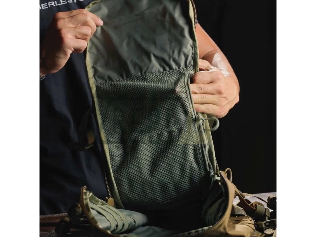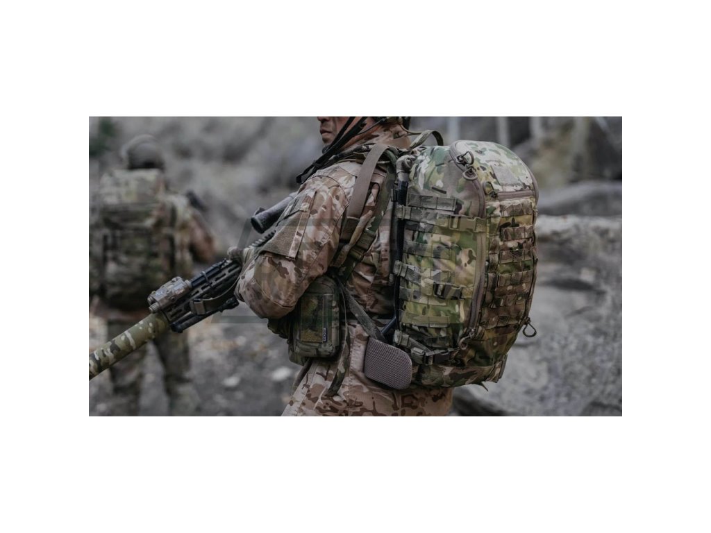 Nosné popruhy jsou jednoduché, velmi mírně polstrované a je možné je v případě nutnosti v dolní části odepnout a vložit do připravené zadní přihrádky. Boky jsou opatřené zipy pro fixaci k nosnému systému, trojicí kompresních popruhů a modulární vazbou. Přední chlopeň disponuje plochou kapsou uzavíranou zipem, panelem suchého zipu a dvěma průvleky. Vstup do hlavního úložného prostoru je řešen pomocí mušlového otevírání. V hlavní komoře naleznete dvě kapsy ze síťoviny a modulární vazbu kombinovanou se suchým zipem. Tato kombinace umožňuje osazení dodatečného vybavení jako jsou lékárny, pouzdra, sumky, VELCRO inserty apod.