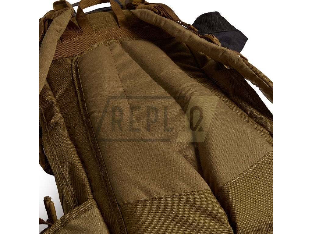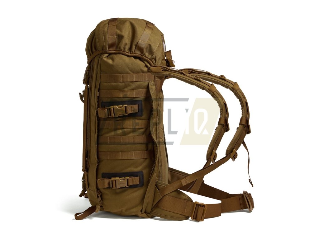 Ramenní popruhy jsou silně polstrované, výškově nastavitelné, anatomicky zakřivené, opatřené stabilizačními popruhy, průvleky pro hadičku hydratačního vaku a elastickým hrudním popruhem, který lze výškově nastavit ve třech slotech. Bederák je lehce polstrovaný v úzké části u batohu a spíná se pomocí plastové přezky Bergbuckle. Záda jsou zpevněna odolnou hliníkovou konstrukcí a mohutně polstrovaná pěnou. Nad popruhy naleznete jednoduché přenášecí madlo a slídové okénko určené pro vaše jmenovky. Na bocích naleznete otvory na provlečení hadičky hydratačního vaku, několik řad modulární vazby standardu MOLLE/PALS a po dvojici kompresních popruhů sloužících k zajištění dodatečné výbavy. V případě potřeby lze využít bočních zipů k připevnění kompatibilního vybavení produktové řady MMPS.