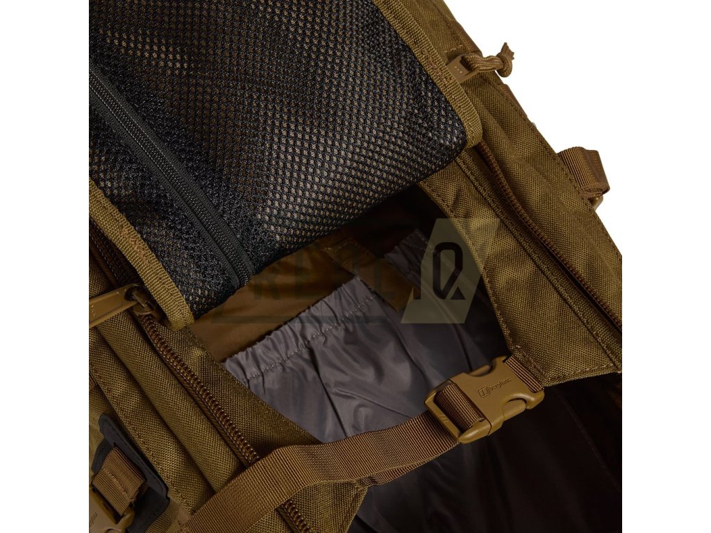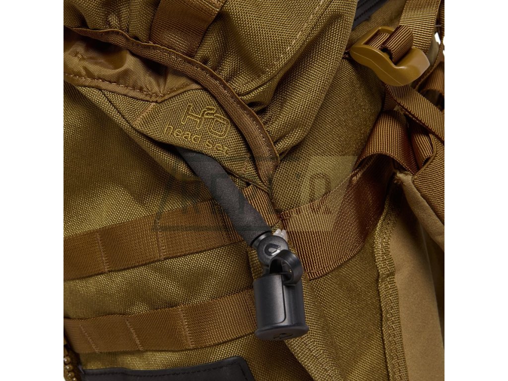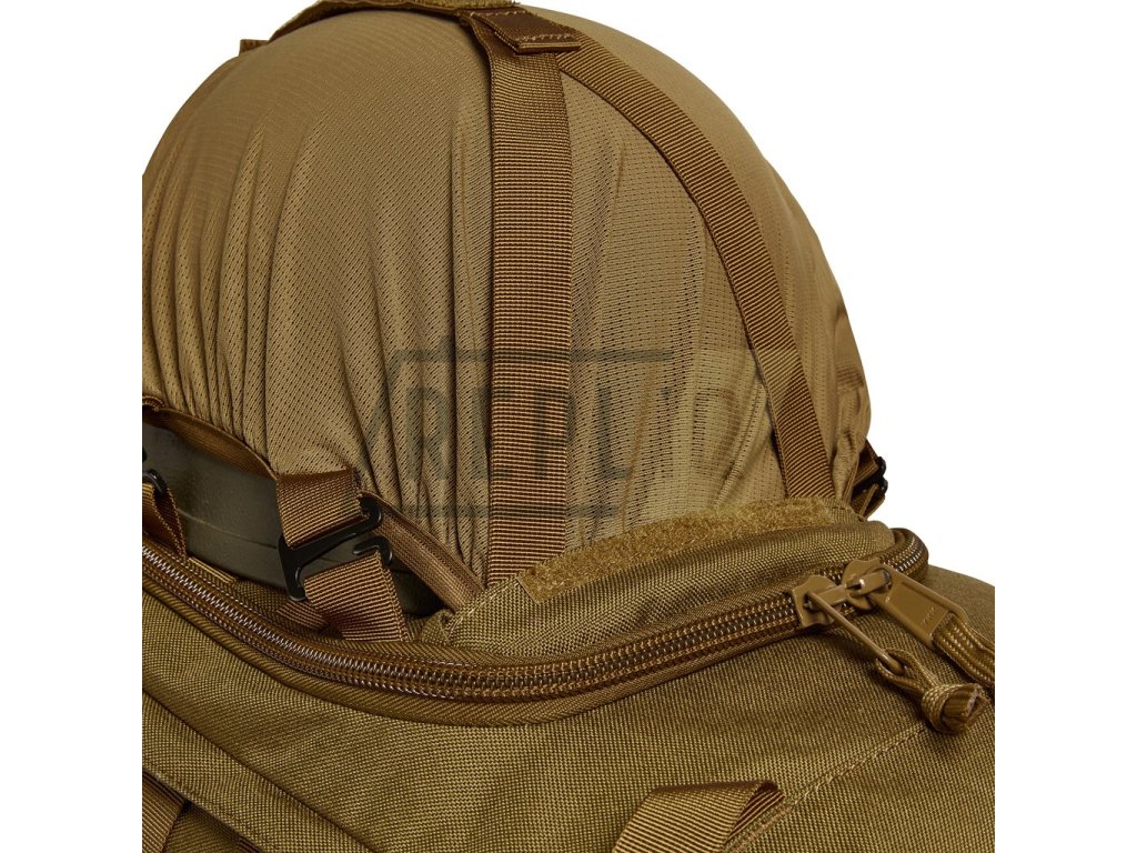 Na přední části naleznete chlopeň pošitou modulární vazbou, která zároveň disponuje skrytou přihrádkou s látkovou kapsou. Ta umožňuje fixaci helmy či podobně rozměrného vybavení k batohu. Zadní strana chlopně je opatřena malou přihrádkou ze síťoviny. Horní víko je jištěno plastovými fastex přezkami a najdete na něm suchý zip pro vaše VELCRO nášivky, dva pruhy modulární vazby a menší kapsu přístupnou skrze zip. V interiéru hlavní kapsy naleznete přihrádku na hydratační vak, několik látkových oček pro případnou fixaci těžšího vybavení a dva jistící popruhy spínané plastovými přezkami. Dno batohu je opatřené kapsou určenou k uložení pláštěnky. Ta není součástí balení batohu.