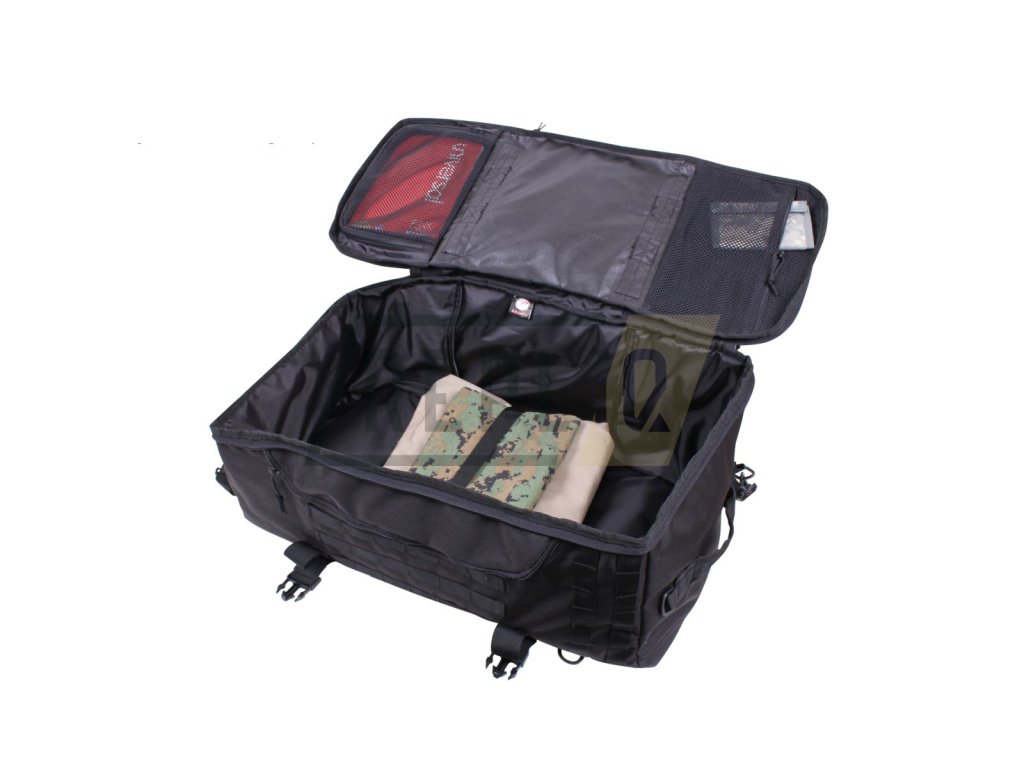 Hlavní kapsa se otevírá pomocí zipu, který je skoro po celém obvodu a umožňuje tak snadný přístup k zabaleným věcem. Jezdci zipu mají očka, kterými lze pro zabezpečení provléknout malý zámeček. Hlavní kapsa se dá pomocí dvou panelů a zipů rozdělit na tři samostatná oddělní. Uprostřed pak najdete popruh s plastovou sponou, který vám umožní věci v tašce lépe zajistit proti pohybu. Ve vnitřní části víka jsou dvě ploché síťované kapsy na zip. Na vnější straně víka jsou kromě madla pro přenášení tašky i 2 + 3 řady MOLLE popruhů a další kapsa na dvoucestný zip. Ta je ideální pro věci, které potřebujete mít při ruce - letenky, doklady, peněženku, ale třeba i litrovou láhev s pitím.