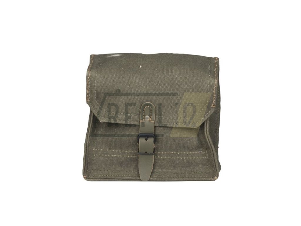 Historická taštička zřejmě používána na náboje. Součástí je kožený masivní popruh přes rameno. Uvnitř dvě komory které mají koženou klopu. Zapínání na jednu koženou přezku. Rozměr cca 20x16x9 cm.