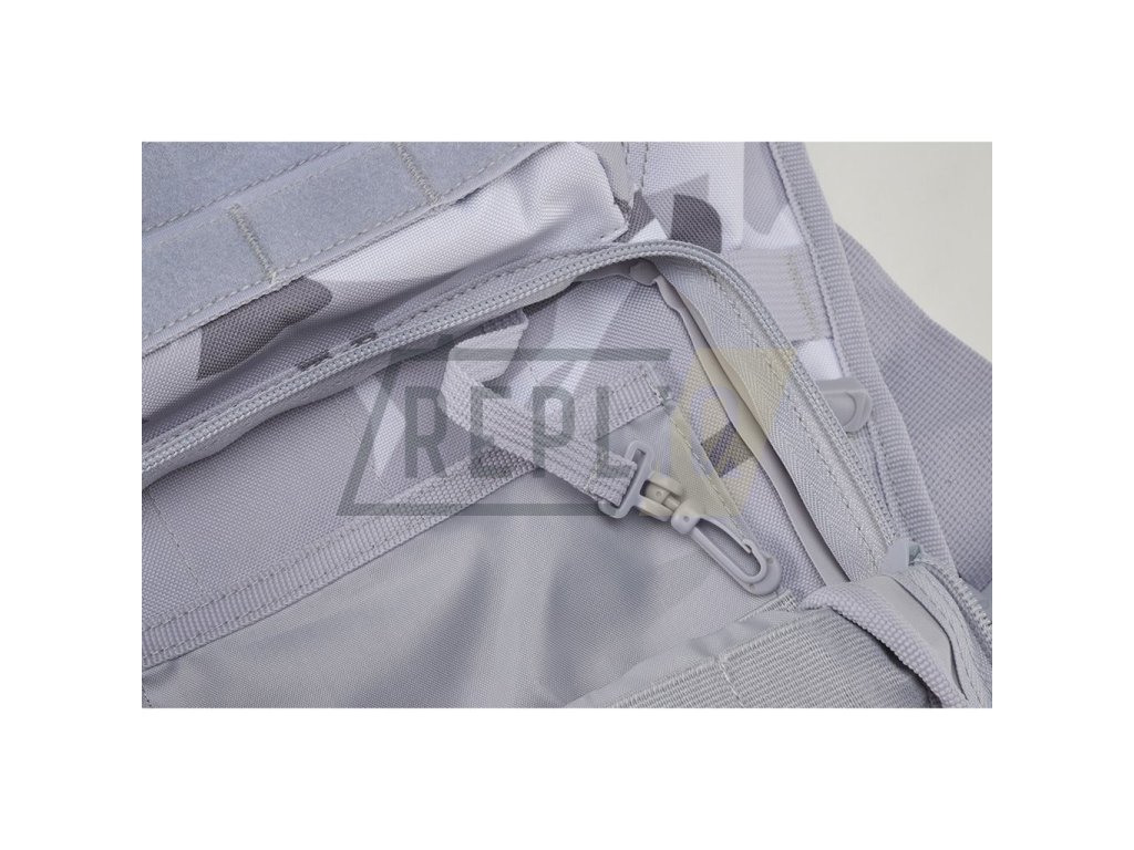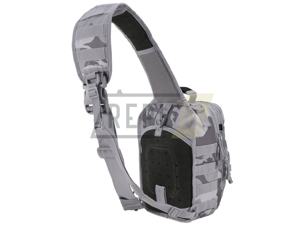Délkově nastavitelný nosný popruh je z velké části polstrovaný pomocí 3D síťoviny, opatřený protiskluzem, plastovými D kroužky, pruženkami a kapsou na smartphone o maximální velikosti 8 x 16 cm. Zapínání popruhu je řešeno pomocí plastové přezky. Boční stabilizační popruh je také zapínaný přezkou a v případě potřeby lze odepnout. Na čelní straně naleznete tři kapsy. Horní kapsa je z vnější strany pokrytá MOLLE/PALS vazbou kombinovanou se suchým zipem pro umístění vašich VELCRO nášivek. Zapíná se jednocestným zipem a v jejím vnitřku naleznete tři pruženky a jednu plochou přihrádku na drobné dokumenty. Spodní kapsa je také pokryta modulární vazbou, disponuje vnější plochou kapsou a vnitřním prostorem bez členění. Hlavní komora je přístupná skrze dvoucestný zip a uvnitř naleznete elastickou přihrádku s pruženkou fixovanou suchým zipem. Další dvě kapsy se nachází na přední straně hlavní komory. Poslední přihrádku naleznete na zadní straně tašky. Ta je z vnější straně opatřena protiskluzem a do svého interiéru pojme tablet o maximální velikosti 16 x 27 cm.