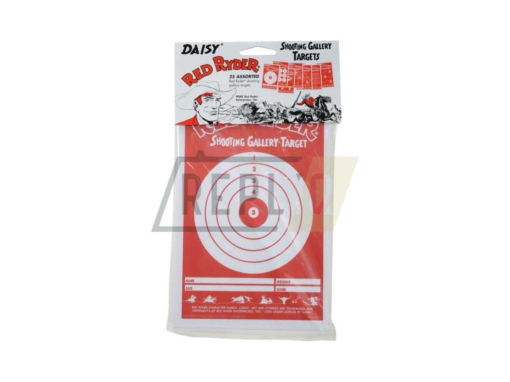 Střelecké terče Daisy Red Ryder Shooting Gallery Targets obsahují 25 papírových terčů, včetně tradičních terčů pro přesnou střelbu, terčů tic-tac-toe nebo terčů v oldschoolovém stylu.Jejich design je inspirován americkými westernovými střelnicemi a laděn v červenobílé koloristice.