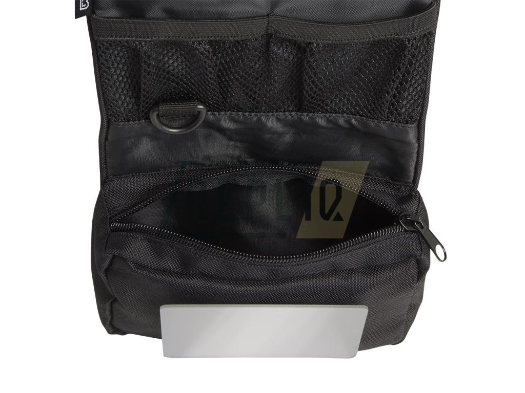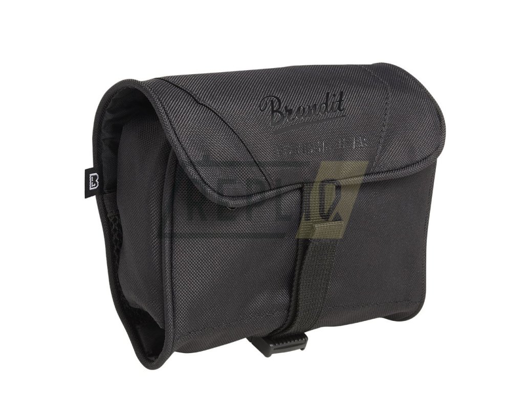 Praktická taška určená především pro uložení hygienických potřeb. Pouzdro je rolovací a v uzavřeném stavu je fixováno pomocí délkově nastavitelného pásku s plastovou přezkou. Po otevření uvnitř naleznete poměrně prostornou kapsu uzavíranou zipem, nerozbitné zrcátko, plastový D kroužek, dvě otevřené přihrádky ze síťoviny, plochou kapsu na zip a panel suchého zipu pro fixaci dodatečného vybavení. Celé pouzdro lze díky plastovému háčku pověsit.