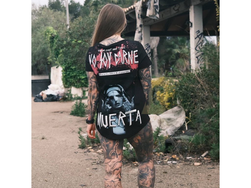 Dámské tričko YAKUZA CARNE. Perfektní pro uvolněný styl: Ne příliš štíhlé, ne příliš volné, tak akorát. Toto tričko má žebrovaný výstřih, zakřivený lem a vintage potisk. Je doplněna logem na bočním švu. Věnujte prosím pozornost našim specifikacím velikosti a pokynům pro praní níže.