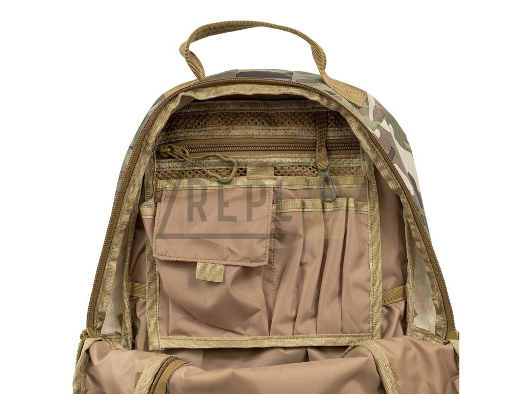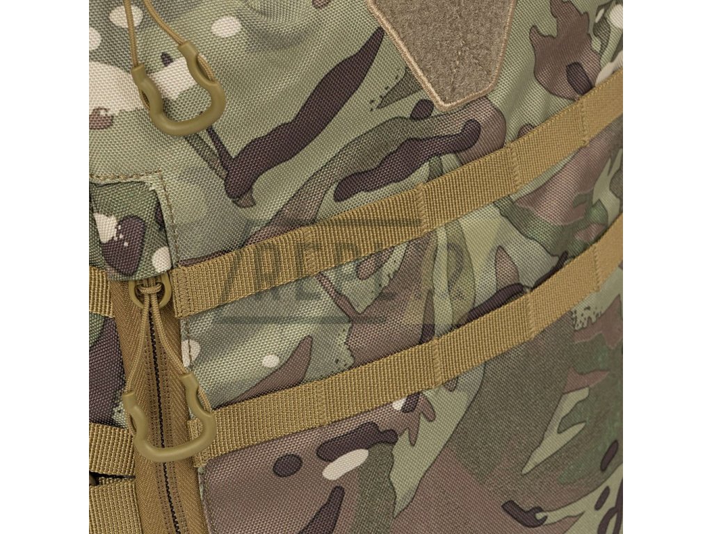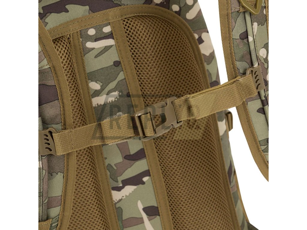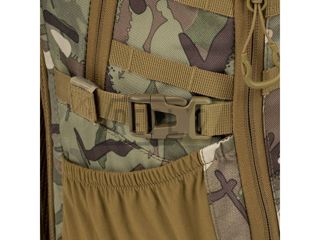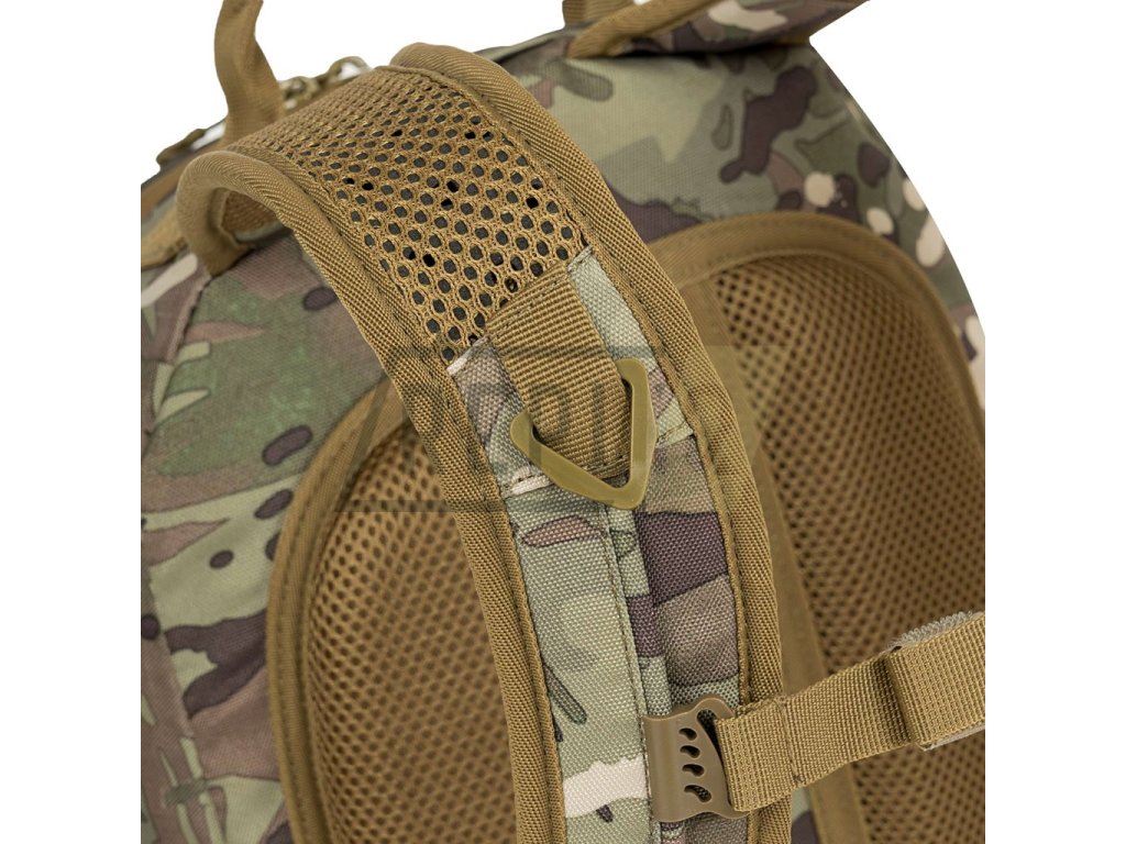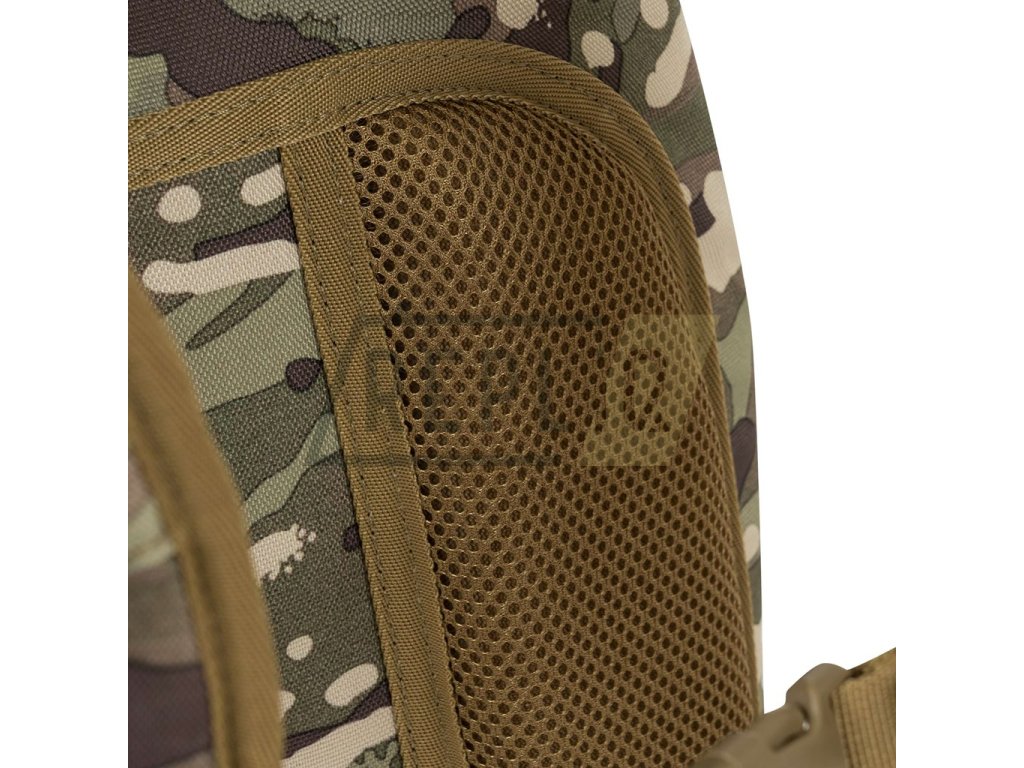 Záda batohu jsou bohatě polstrována pomocí 3D síťoviny jejíž tvar zachovává středový kanálek zlepšující odvětrávání. Nosné popruhy jsou nastavitelné, polstrované, disponují stabilizačními popruhy, plastovými triangly a výškově nastavitelným elastickým hrudním popruhem, který je spínán plastovou přezkou. Na bocích batohu naleznete dvě řady redukované MOLLE/PALS vazby, kompresní popruhy spínané plastovou přezkou a elastické kapsy. Přední část batohu je opatřena dvěma pruhy MOLLE/PALS vazby, prostornou středovou přihrádkou, vrchní kapsou a dvěma VELCRO panely.