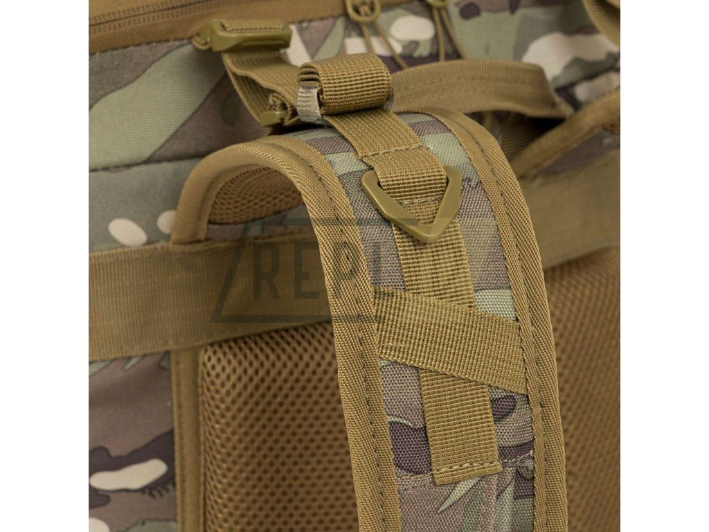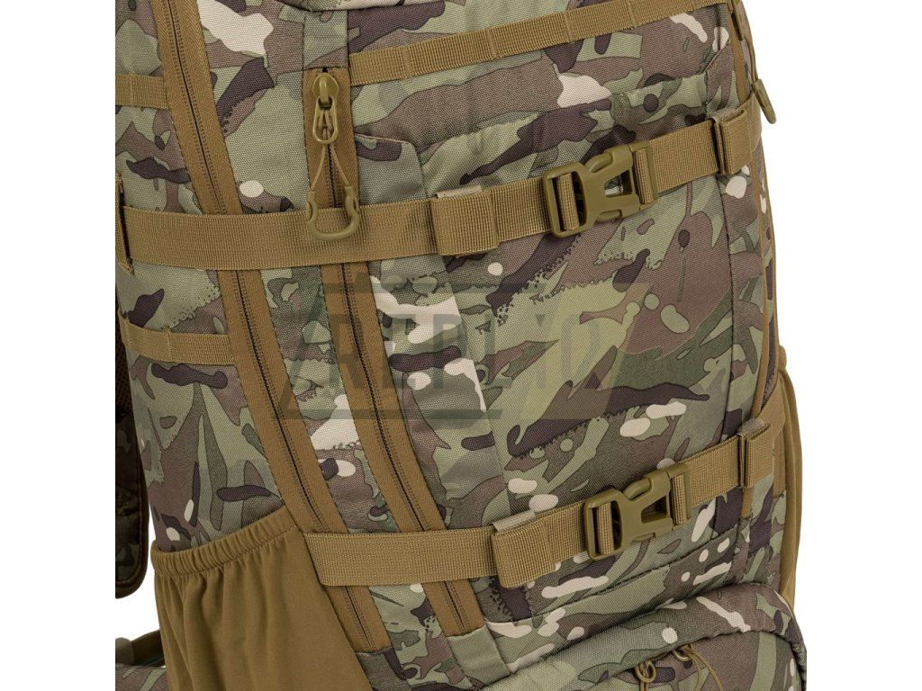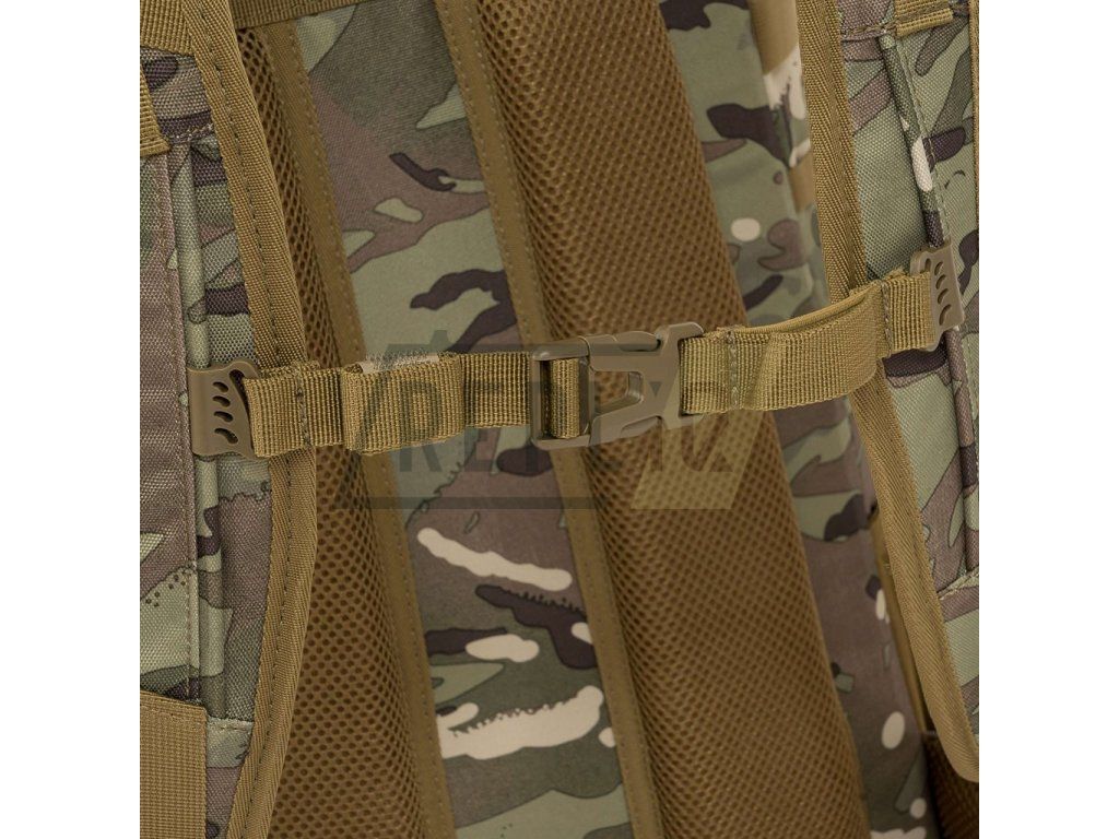 Záda batohu jsou bohatě polstrována pomocí 3D síťoviny jejíž tvar zachovává středový kanálek zlepšující odvětrávání. V horní části zad naleznete klasické látkové madlo na přenášení. Nosné popruhy jsou plně nastavitelné, polstrované, disponují stabilizačními popruhy, plastovými triangly, průvleky na protažení hadičky hydratačního vaku a výškově nastavitelným, elastickým hrudním popruhem, který je spínán plastovou přezkou. Bederák batohu je částečně polstrovaný, spínaný plastovou přezkou a na obou stranách disponuje menšími kapsami uzavíranými zipem. Na bocích batohu naleznete tři řady redukované MOLLE/PALS vazby, elastické kapsy a kompresní popruhy, které jsou spínané pomocí plastových přezek. Hlavní chlopeň batohu je opatřena pruhem MOLLE/PALS vazby, prostornou středovou přihrádkou, vrchní kapsou a malým VELCRO panelem.