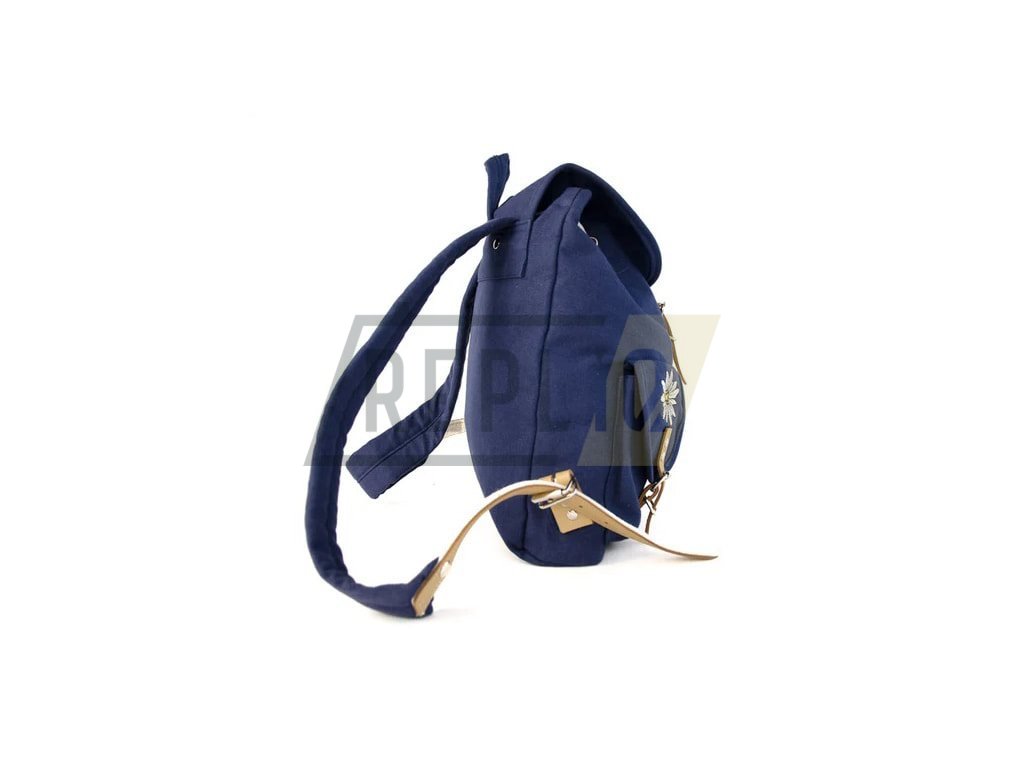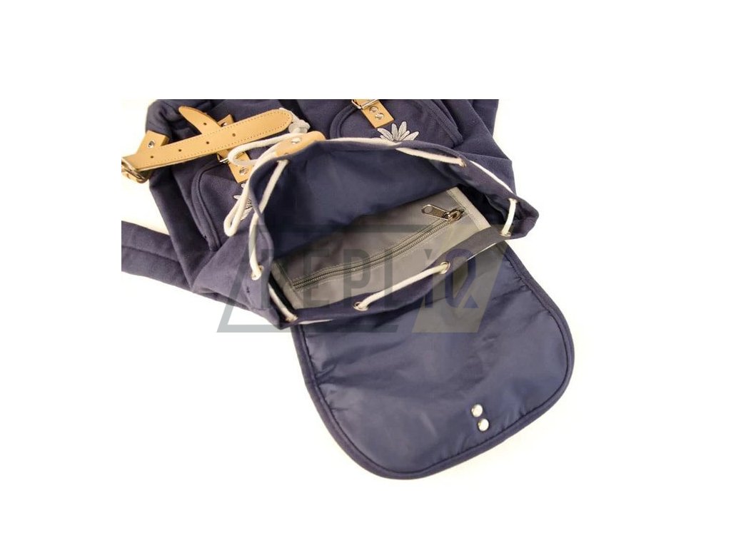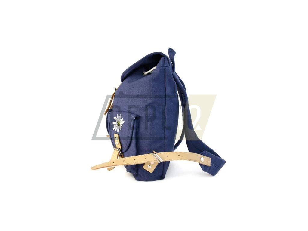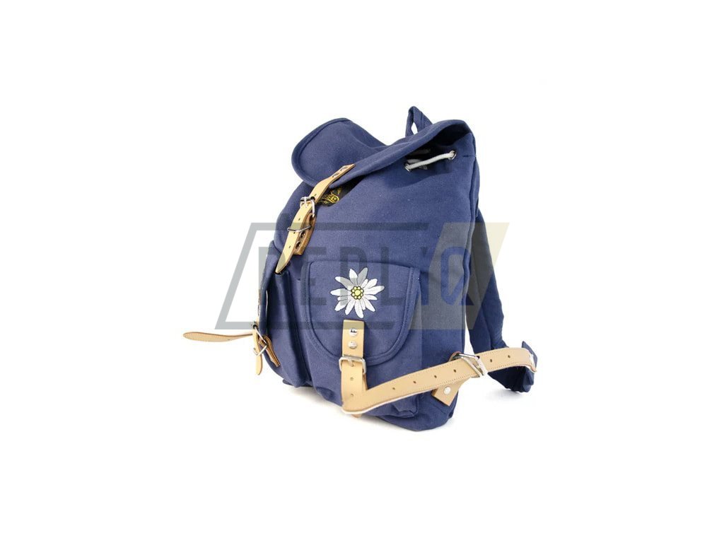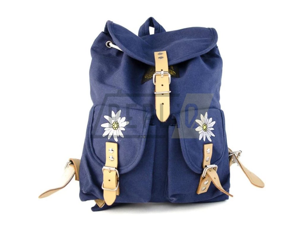 Dětský/dámský batůžek vyrobený z pevného bavlněného plátna a doplněný o vyšité vyobrazení takzvané alpské protěže (Edelweiss). Veškerý úložný prostor batohu je uzavíraný pomocí kožených popruhů s kovovými přezkami.