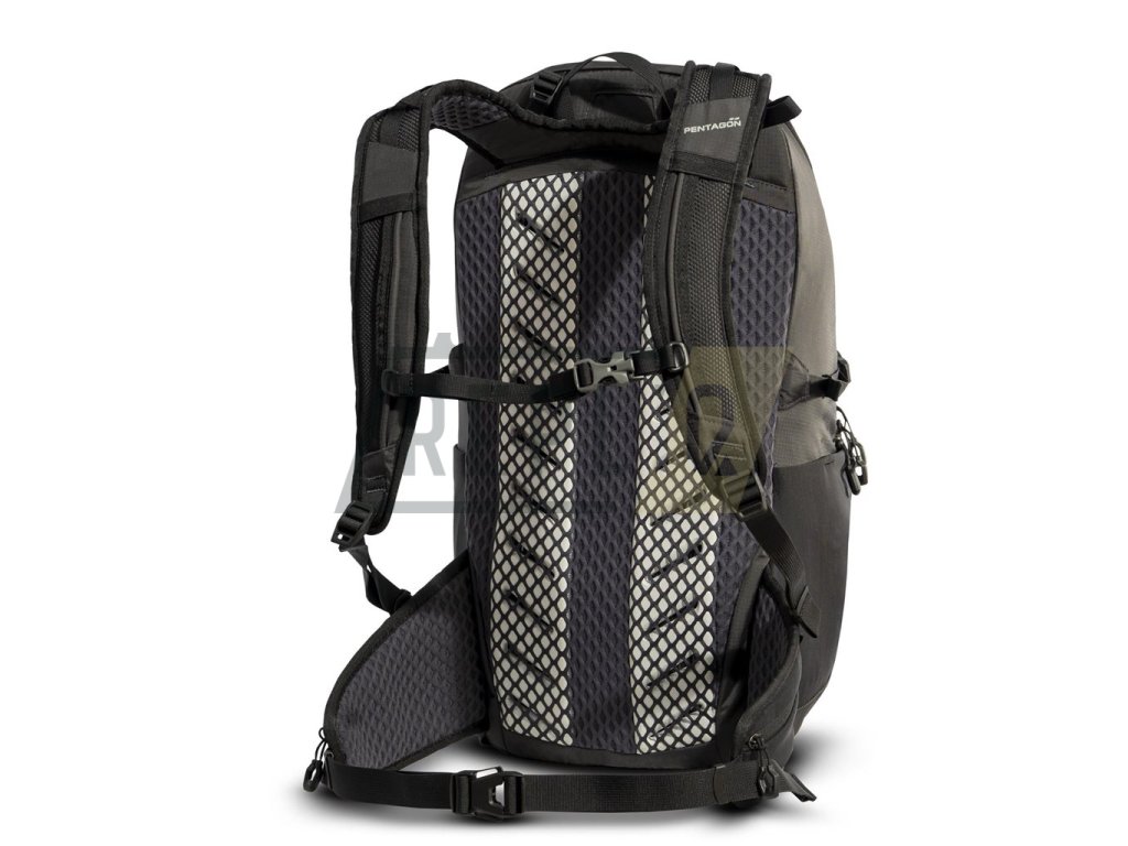 Zádové popruhy jsou mírně zakřivené, délkově stavitelné opatřené stabilizačními popruhy a výškově nastavitelným hrudním popruhem spínaným plastovou přezkou. Bederák je z části polstrovaný, opatřeny kapsičkami na drobnosti a spínaný přezkou. Záda jsou pro maximalizaci komfortu při nošení vyztužena pomocí vnitřního rámu a opatřena extra prodyšnou 3D síťovinou. Boky jsou opatřeny rozměrnými elastickými kapsami na láhve či jinou výbavu a kompresními popruhy s přezkou. Na pravé straně batohu navíc naleznete praktické průvleky na pohodlné přenášení turistických holí. Na čelní straně naleznete menší plochou kapsu na dokumenty a tři elastické průvleky. Obě hlavní komory batohu jsou přístupné skrze dvoucestné zipy s mohutnými hmatníky. Přední komora obsahuje dvě elastické přihrádky.
