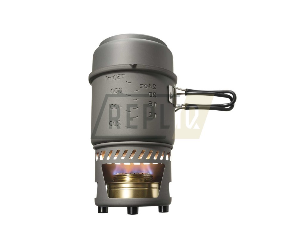 Souprava na vaření 985 ml obsahující 2 hrnce a hořák na tuhý a tekutý líh. Ideální všude tam, kde můžete mít problém sehnat jako palivo plyn nebo benzín. Materiály použité při výrobě výrazně snížily hmotnost, přičemž pevnost materiálu zůstává beze změny. Tvrzený hliník je vysoce odolný proti poškození a zároveň mnohem lehčí než ocel. Sada obsahuje: - Hrnec, který má měrku pro přesné měření tekutin. Ražené stupnice jsou trvanlivé, odolné proti oděru a vysokým teplotám. Zůstanou viditelné po celou dobu používání. Sklopné rukojeti z nerezové oceli pro pohodlnější balení včetně tepelné izolace proti popálení. - Hořák včetně podstavce se pro snadnější přepravu a úsporu místa dají složit přímo do hrnce. Takto můžete mít celé balení kompaktní. Jako palivo lze použít pevný líh Esbit (není součástí balení). Celá souprava je zabalena v silném nylonovém transportním obalu ze síťoviny. Váha 197 g.