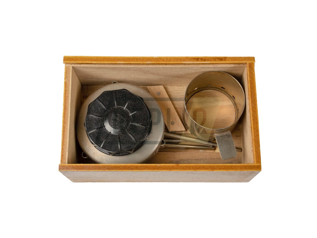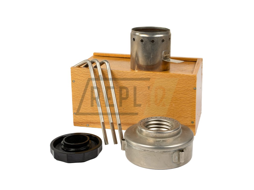 Malý lihový vařik od výrobce PREMA Stará Tura. Rok výroby kolem 1960-1970. Balen v pěkné dřevěné lakované krabičce se zasouvacím víčkem.