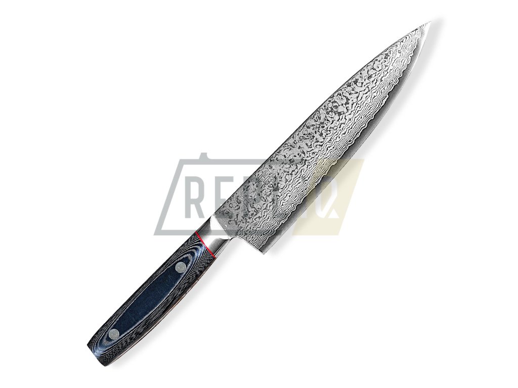 Robustní, velmi ostrý a těžký japonský nůž GYUTO/Chef 200 mm z japonské damaškové oceli VG-10 s působivým designem a nejvyšší kvalitou. Hřbet nože a ostří se zužují do špičky pro všestranné využití mimořádné řezné síly. Krájení, plátkování, čištění masa, ovoce a zeleniny – nic nebude pro tento jedinečný nůž japonského tvaru problémem. Kuchařský nůž GYUTO je díky výše položenému hrotu, též vhodný ke kolébkovému krájení bylinek, zeleniny a ořechů. Dlouhá čepel a rukojeť západního stylu Vám poskytne tu nejlepší kontrolu při řezání a krájení. Japonské umění, preciznost a nové technologie činí tento nůž jedinečným a nenapodobitelným.