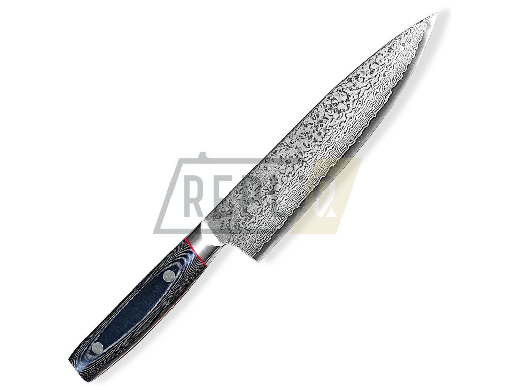 Robustní, velmi ostrý a těžký japonský nůž GYUTO/Chef 230 mm z japonské damaškové oceli VG-10 s působivým designem a nejvyšší kvalitou. Hřbet nože a ostří se zužují do špičky pro všestranné využití mimořádné řezné síly. Krájení, plátkování, čištění masa, ovoce a zeleniny – nic nebude pro tento jedinečný nůž japonského tvaru problémem. Kuchařský nůž GYUTO je díky výše položenému hrotu, též vhodný ke kolébkovému krájení bylinek, zeleniny a ořechů. Dlouhá čepel a rukojeť západního stylu Vám poskytne tu nejlepší kontrolu při řezání a krájení. Japonské umění, preciznost a nové technologie činí tento nůž jedinečným a nenapodobitelným.