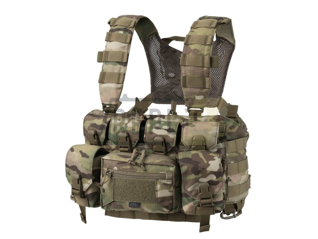 Nosné popruhy rigu jsou díky použitým plastovým přezkám odepínatelné, opatřené prodyšnou síťovinou, přenášecím madlem a pruhy nosné vazby. Čtyři sumky s odepínatelnou chlopní jsou určené pro zásobníky AR či AK. Čelní administrativní kapsa je podšita jemným flaušem pro připevnění dodatečných organizérů a na její čelní straně naleznete menší plochou přihrádku a suchý zip pro vaše VELCRO nášivky či jmenovky. Na obou stranách administrativní kapsy se nachází sumky pro umístění fragmentačních či kouřových granátů. Na bocích je chest rig pošit modulární vazbou standardu MOLLE/PALS, což umožňuje fixaci dodatečného kompatibilního vybavení. Uvnitř chest rigu se nachází rozměrná kapsa uzavíraná zipem. Ta je perfektní pro umístění map, zápisníků a podobně rozměrného vybavení. Dvojice sumek na vnitřní straně je určená pro uložení rádia.
