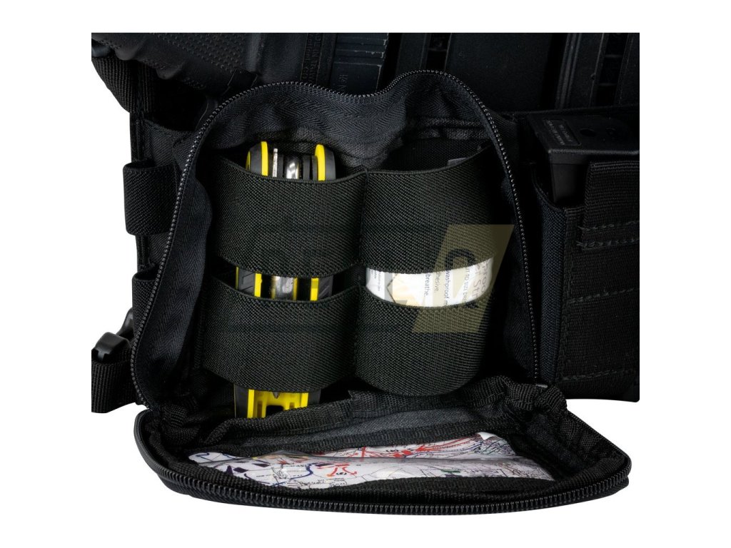 Celou šířku chest rigu za předními sumkami zabírá přihrádka podšitá suchým zipem. Ta slouží k vložení elastických insertů (vkládacích sumek pro zásobníky ráže .308 / .223 / 9 mm L) z kolekce VX nebo jiných kompatibilních. Do boků rigu jsou všitá poutka z pruženky umožňující např. provléknutí tyčinek chemických světel (lightsticků). Nosnou kapacitu chest rigu lze dále zvýšit uchycením podvěsné ledvinky nebo boků s modulární vazbou přes suchý zip na zadní straně vesty.