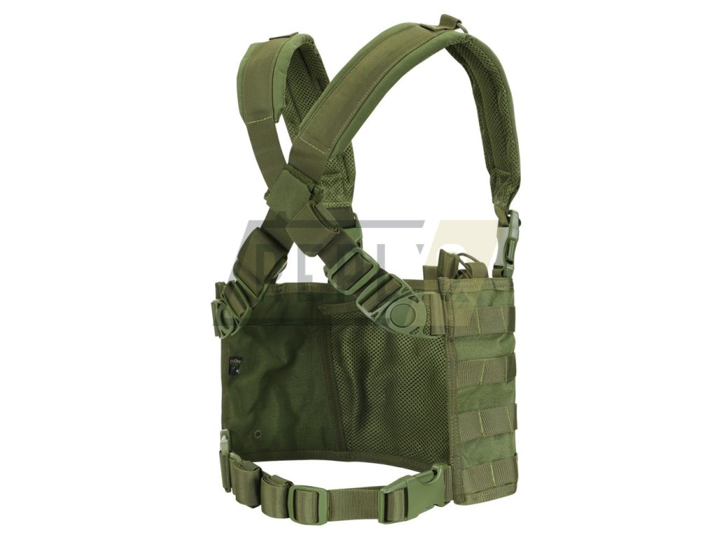 Vesta OPS Chest Rig od amerického výrobce firmy Condor Outdoor, taktická vesta klasického střihu s velkým předobočním panelem, který je osazen PALS vazbou pro individuální nastrojení příslušenství MOLLE. Panel má čtyři řady vazby PALS, na bocích dvě vestavěné, otevřené kapsy pro zásobníky a přední hlavní kapsu o rozměru 18 x 28 cm, například pro mapu. Panel má polstrované, křížové Cross-back ramenní popruhy s otočnými Swivi Lockster fastex zadními sponami. V horní části jsou popruhy osazeny D-kroužky. Vesta má oboustraně stavitelný bederní popruh.
