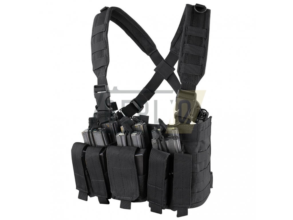 Taktická vesta Recon Chest Rig od amerického výrobce firmy Condor Outdoor, profesionální vesta s napevno vestavěnými pouzdry pro zásobníky. Tři dvojité sumky pro zásobníky typu M4 a čtyři a jedna dvojitá sumka pro zásobníky pistolové. Na bocích vesty zůstává prostor s PALS vazbou pro individuální nastrojení MOLLE výstroje. V předním panelu za sumkami je integrovaná admin kapsa se zapínáním na suchý zip, například pro mapu, nebo dokumenty. Vesta má polstrované, křížové Cross-back ramenní popruhy s otočnými Swivi Lockster fastex zadními sponami. V horní části jsou popruhy osazeny D-kroužky. Vesta má oboustraně stavitelný bederní popruh.